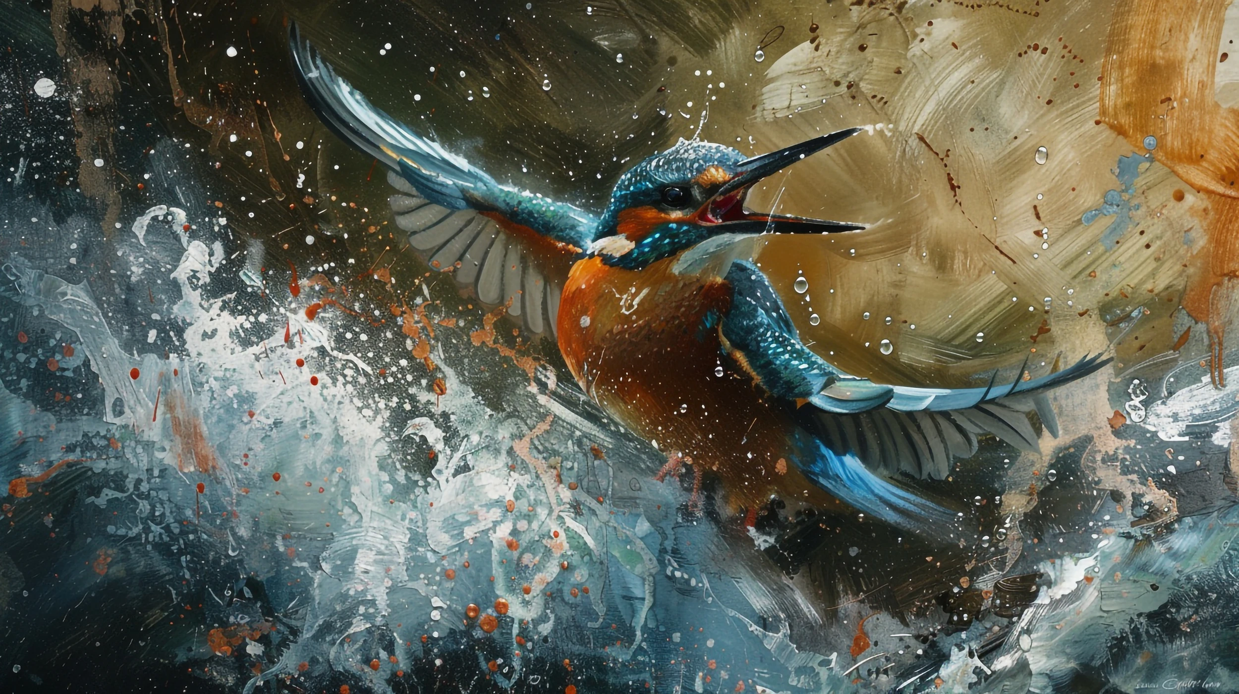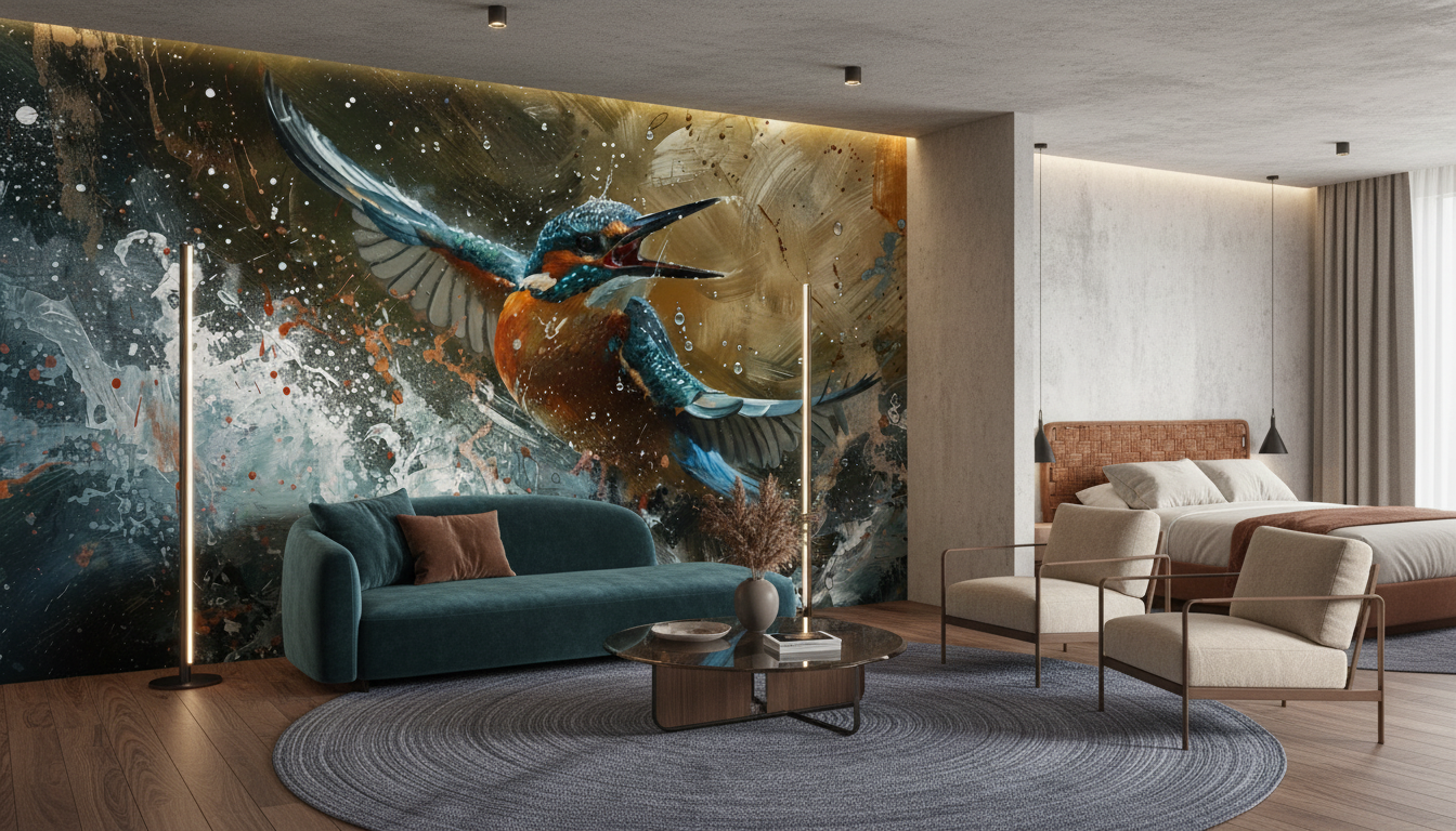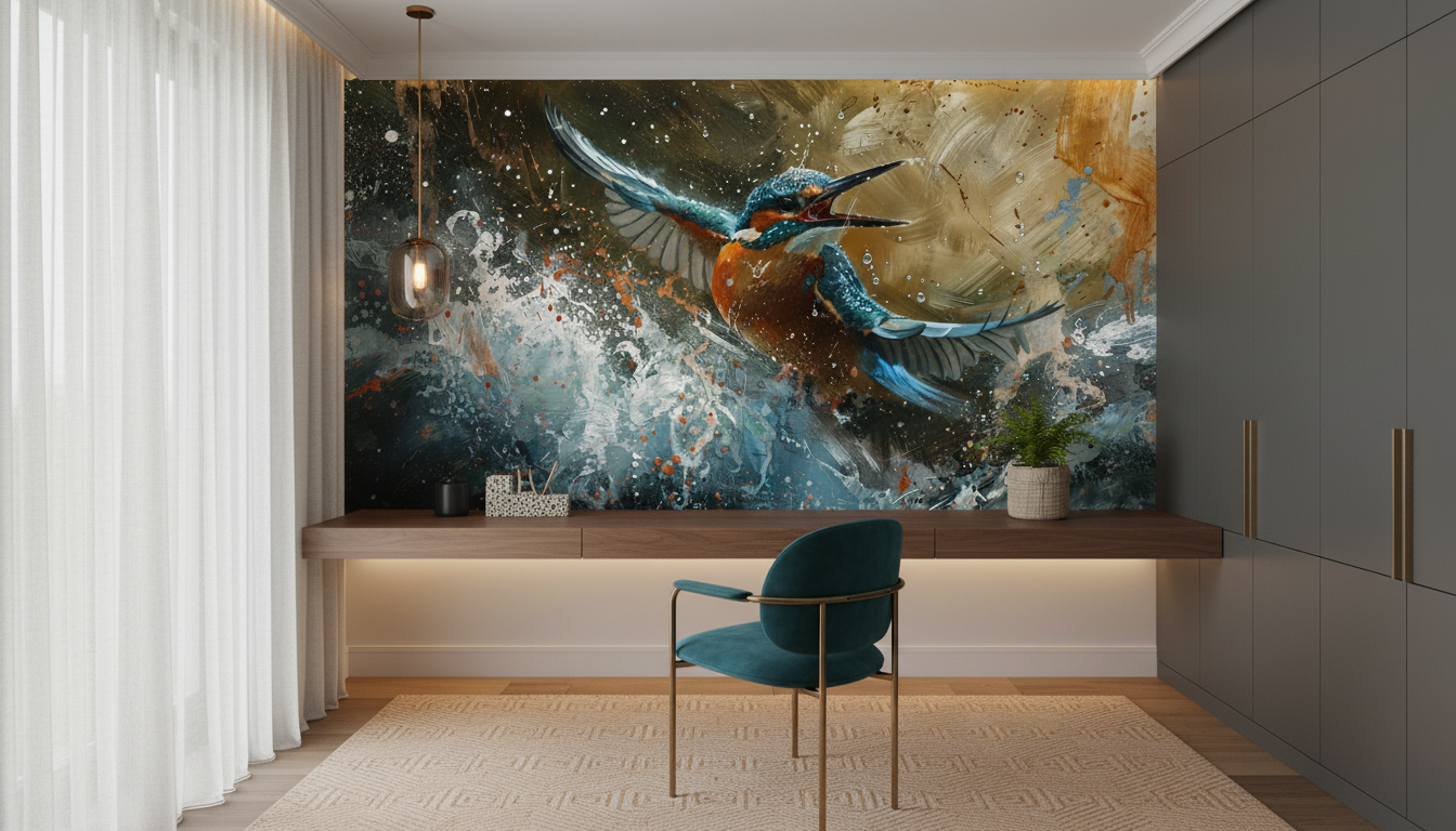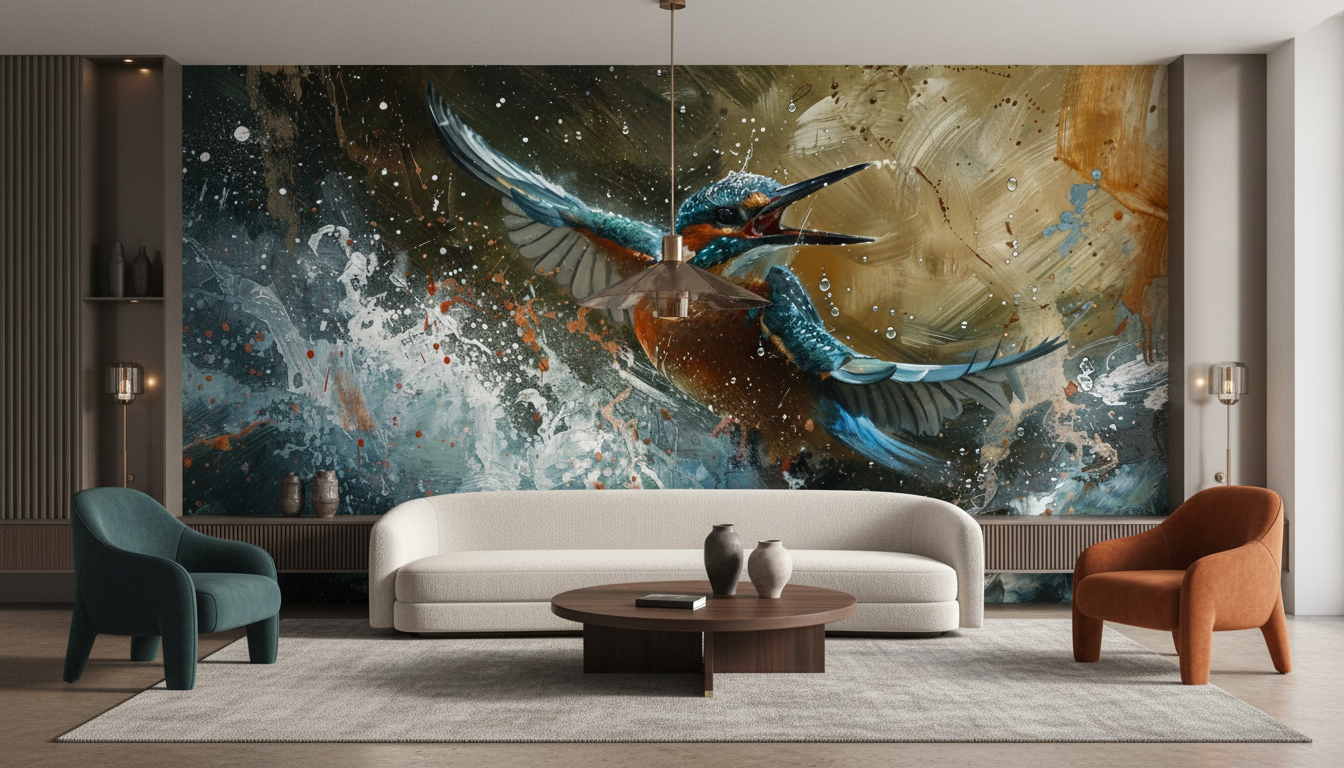 Dans un éclaboussement de couleurs vives et de mouvement perpétuel, ce papier peint artistique capture l’instant magique où un martin-pêcheur fend la surface de l’eau dans une danse aquatique spectaculaire.