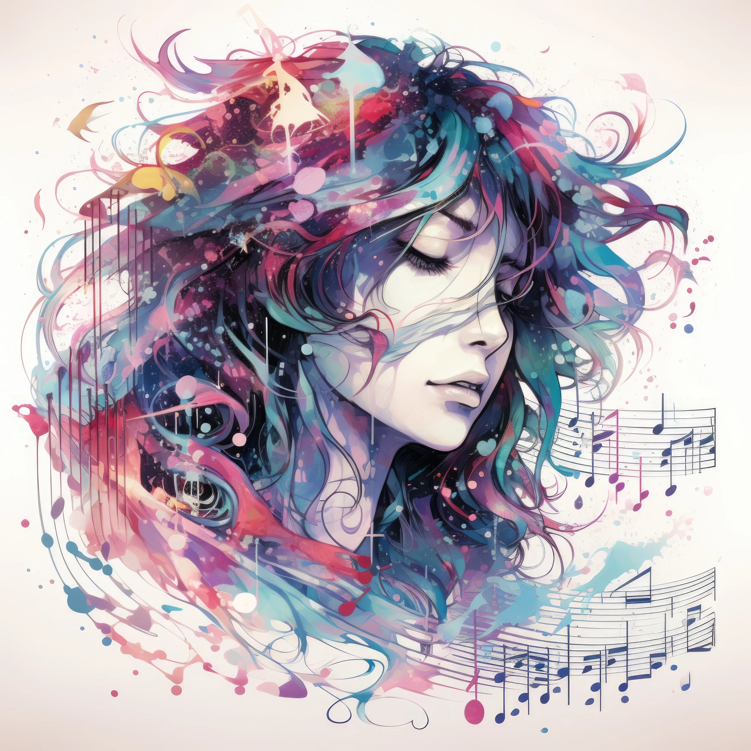 Ce papier peint artistique révèle le portrait saisissant d’une jeune femme aux yeux clos, plongée dans une méditation musicale profonde. Sa chevelure se transforme en un nuage de couleurs abstraites, mêlant des tons violets profonds, des roses intenses et des bleus océaniques dans un dégradé aquarellé d’une rare beauté. Les notes de musique s’échappent délicatement du motif, créant un mouvement fluide qui semble danser autour du personnage. Le style graphique combine habilement la technique de l’aquarelle moderne avec des éléments de street art contemporain, offrant un rendu à la fois délicat et vibrant d’énergie.