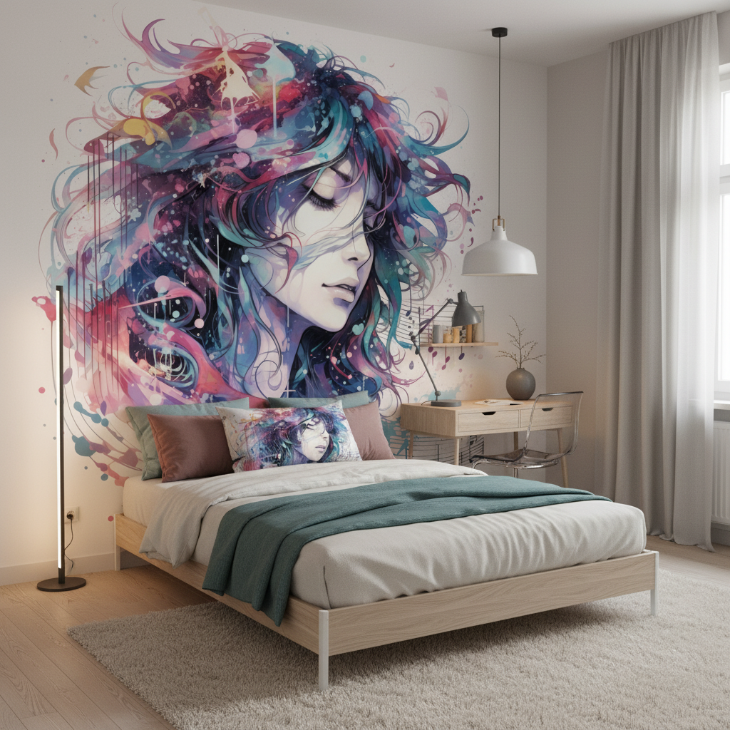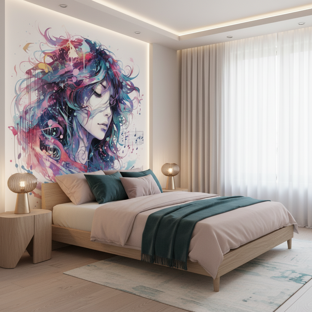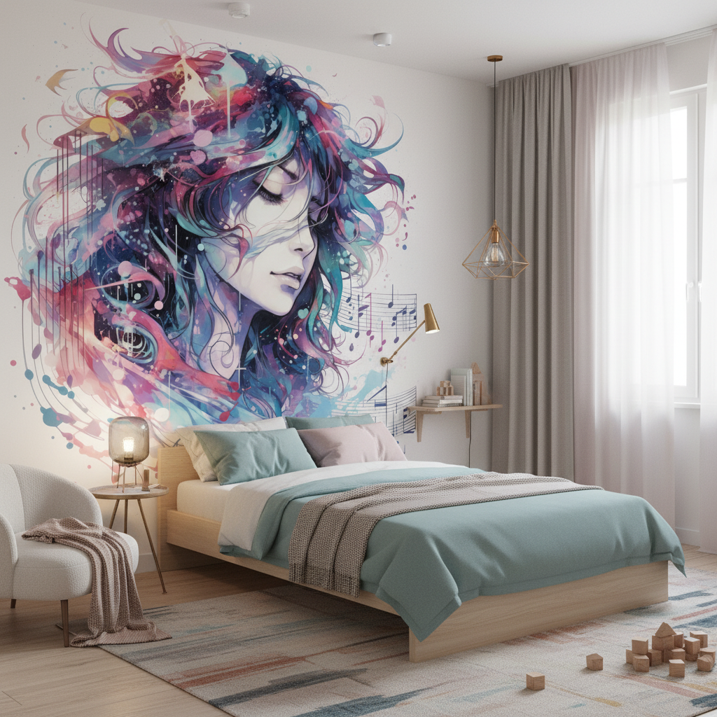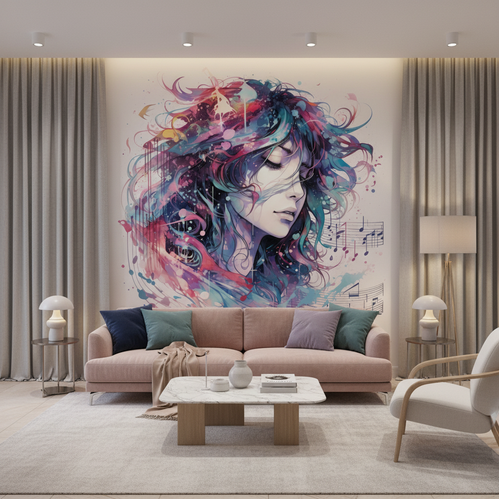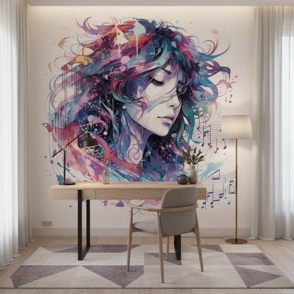 Transformez votre intérieur avec ce papier peint artistique sur mesure. Un portrait féminin aquarellé, vibrant de musique et de couleurs intenses. Créez une atmosphère zen, inspirante et profondément originale.