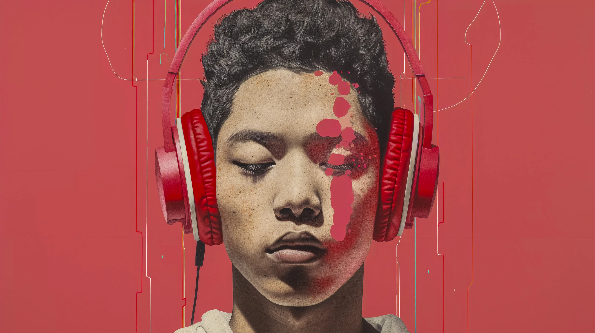 Ce papier peint artistique révèle un portrait saisissant aux accents surréalistes, où se mêlent harmonieusement réalisme photographique et création numérique. Le style graphique contemporain présente une jeune femme aux boucles généreuses, plongée dans une méditation musicale profonde, ses yeux clos exprimant une sérénité absolue. Le casque audio rouge devient l’élément central de cette composition, symbole moderne de l’évasion sonore et de la connexion artistique.