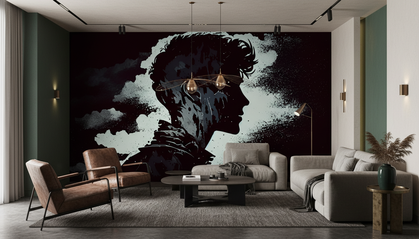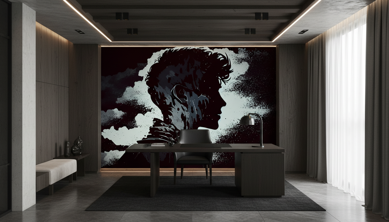 Ce papier peint design insuffle instantanément une atmosphère contemplative et sophistiquée dans l’espace. Il dégage une énergie créative intense, invitant à la méditation artistique et à l’introspection poétique. L’ambiance générale oscille entre mélancolie moderne et force expressive, créant un cocon intellectuel propice à la créativité.