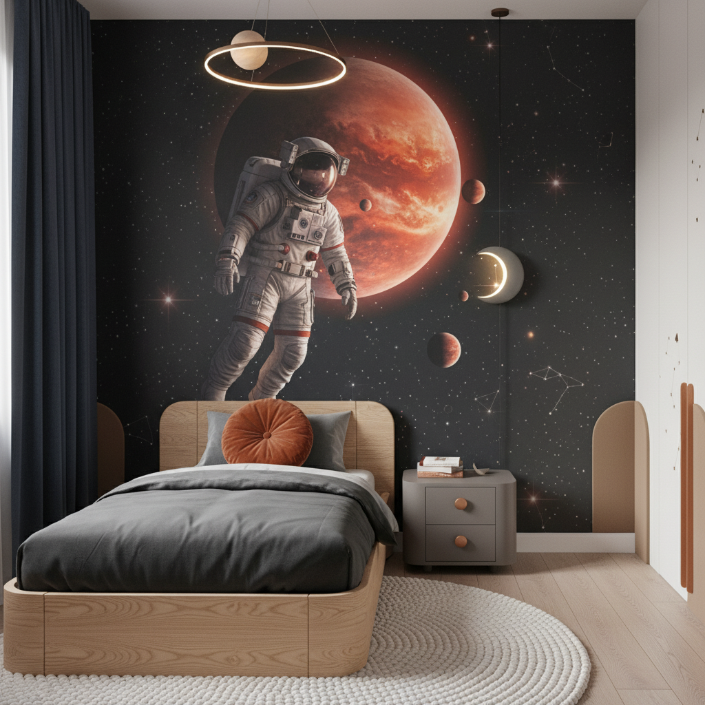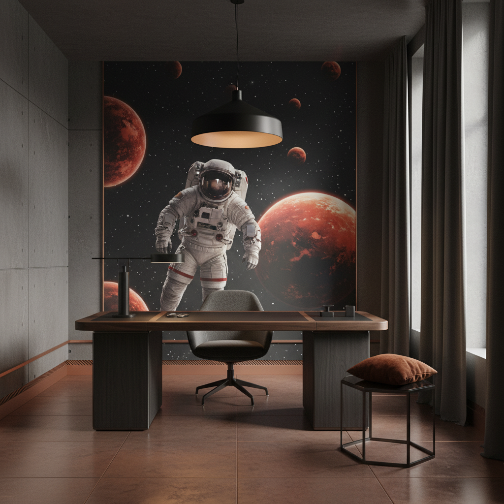 Ce papier peint décoratif spatial trouve naturellement sa place dans un bureau moderne où il stimulera la créativité et l’ambition, ou dans une chambre d’adolescent passionné d’astronomie. Il sublimera également un salon contemporain en tant que mur d’accent spectaculaire. Associez-le à du mobilier métallique aux finitions brossées, des éclairages LED aux tons chauds, et des matières comme le cuir vieilli ou l’acier patiné pour créer une ambiance industrielle futuriste. Les teintes complémentaires idéales incluent les gris anthracite, les blancs immaculés et les touches de cuivre pour faire écho aux nuances cosmiques.