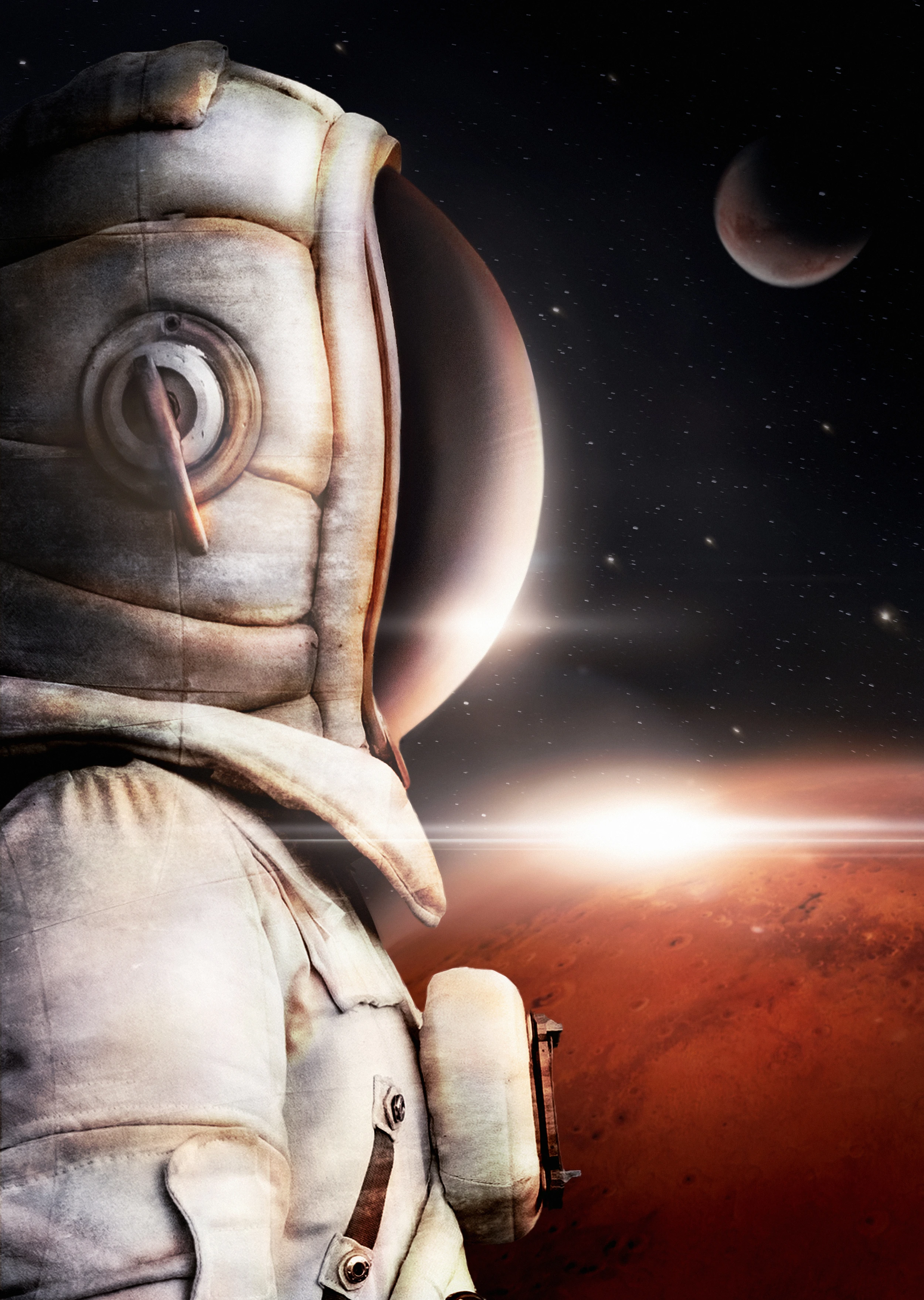 L’arrière-plan déploie un paysage spatial époustouflant : la surface ocre et poussiéreuse d’une planète lointaine s’étend sous un ciel d’encre constellé d’étoiles scintillantes. Une planète mystérieuse flotte dans l’obscurité cosmique, tandis que l’horizon s’embrase de nuances cuivrées et orangées, évoquant un lever de soleil extraterrestre. Cette illustration spatiale hyperréaliste mêle avec brio les tons chauds dorés aux profondeurs sombres de l’univers, créant un contraste visuel saisissant.