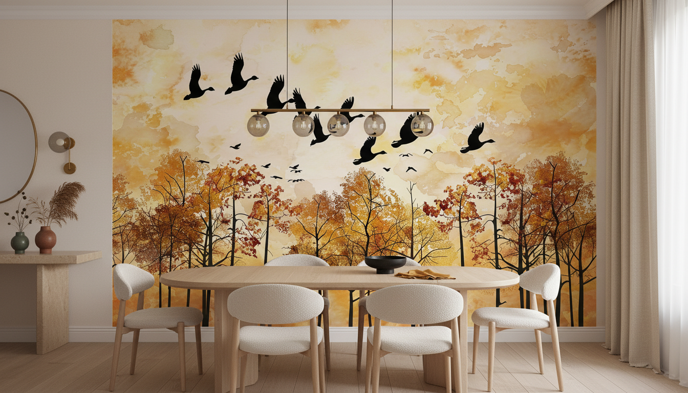 Ce papier peint automnal insuffle une atmosphère de quiétude contemplative à votre espace de vie. Il évoque la nostalgie douce des migrations saisonnières, cette mélancolie apaisante qui accompagne les changements de saison. L’ambiance cocooning qu’il dégage transforme instantanément votre intérieur en refuge chaleureux, propice à la détente et à l’introspection.