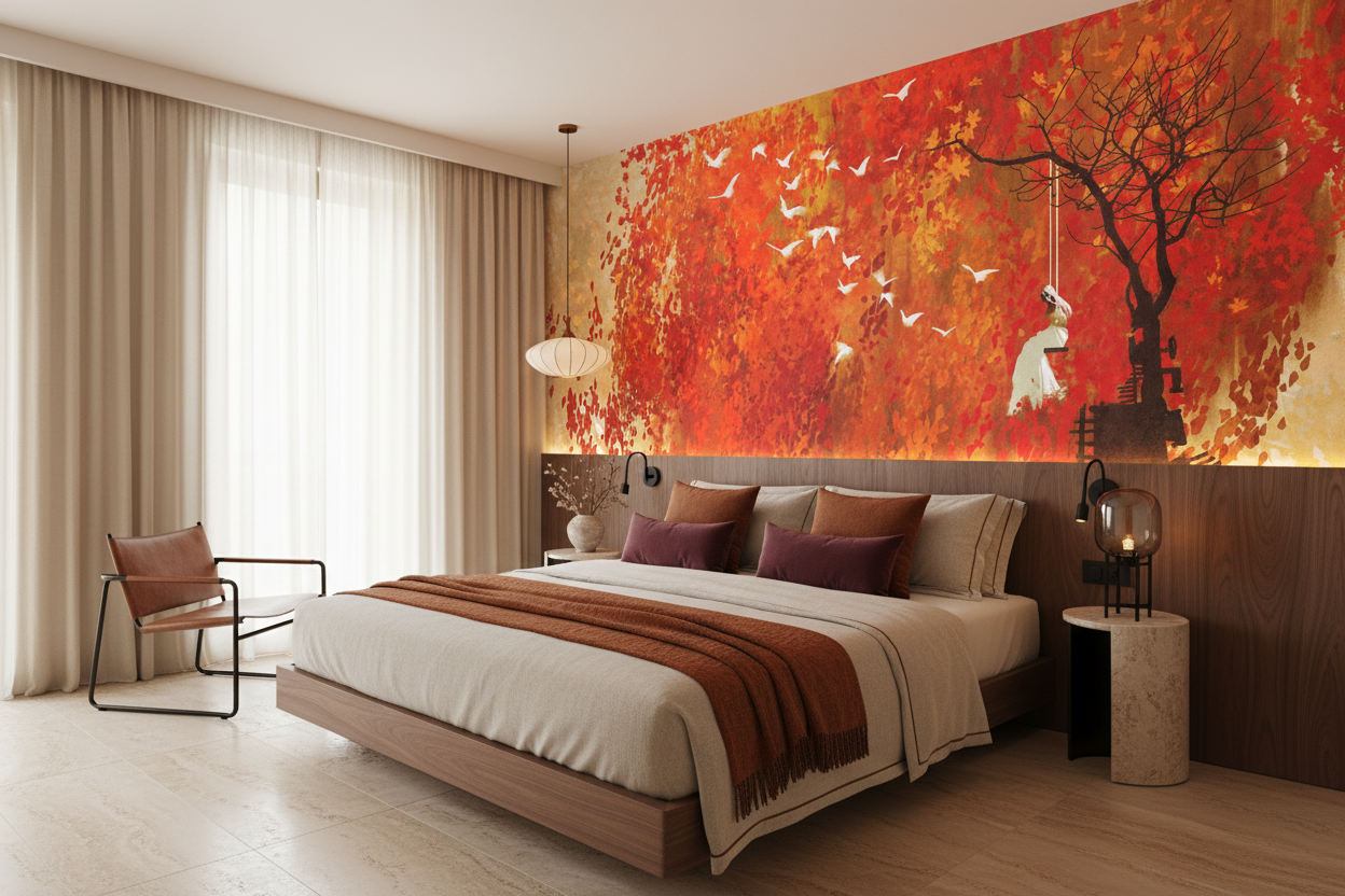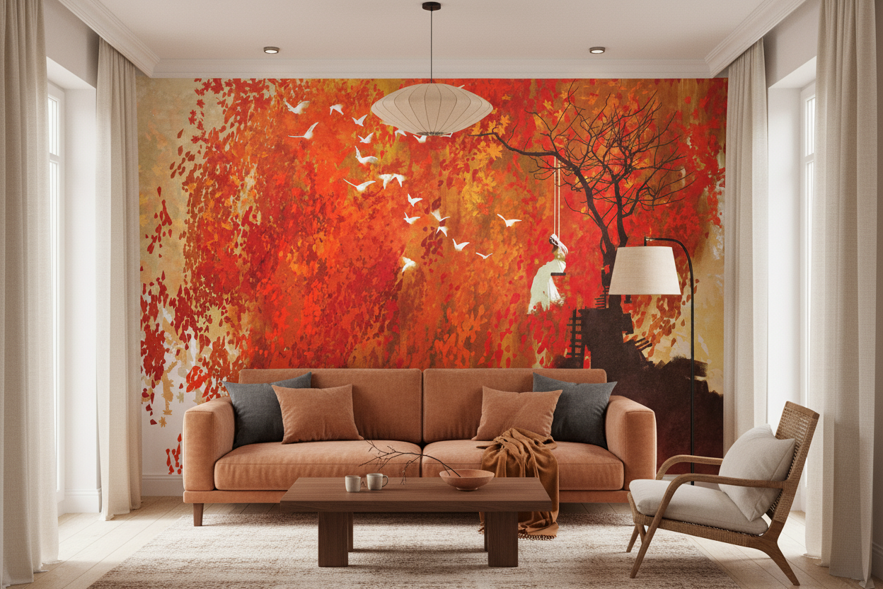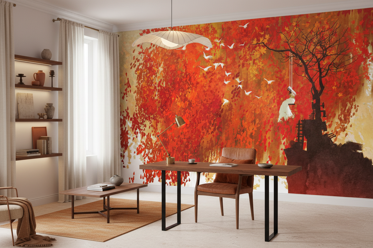 Ce papier peint panoramique automnal trouve naturellement sa place dans un salon contemporain où il constituera un magnifique mur d’accent, créant un point focal d’une rare intensité. Dans une chambre parentale, il installe une ambiance intime et apaisante, propice aux moments de détente. L’espace bureau se pare également d’une aura inspirante grâce à cette œuvre stimulante pour la créativité.