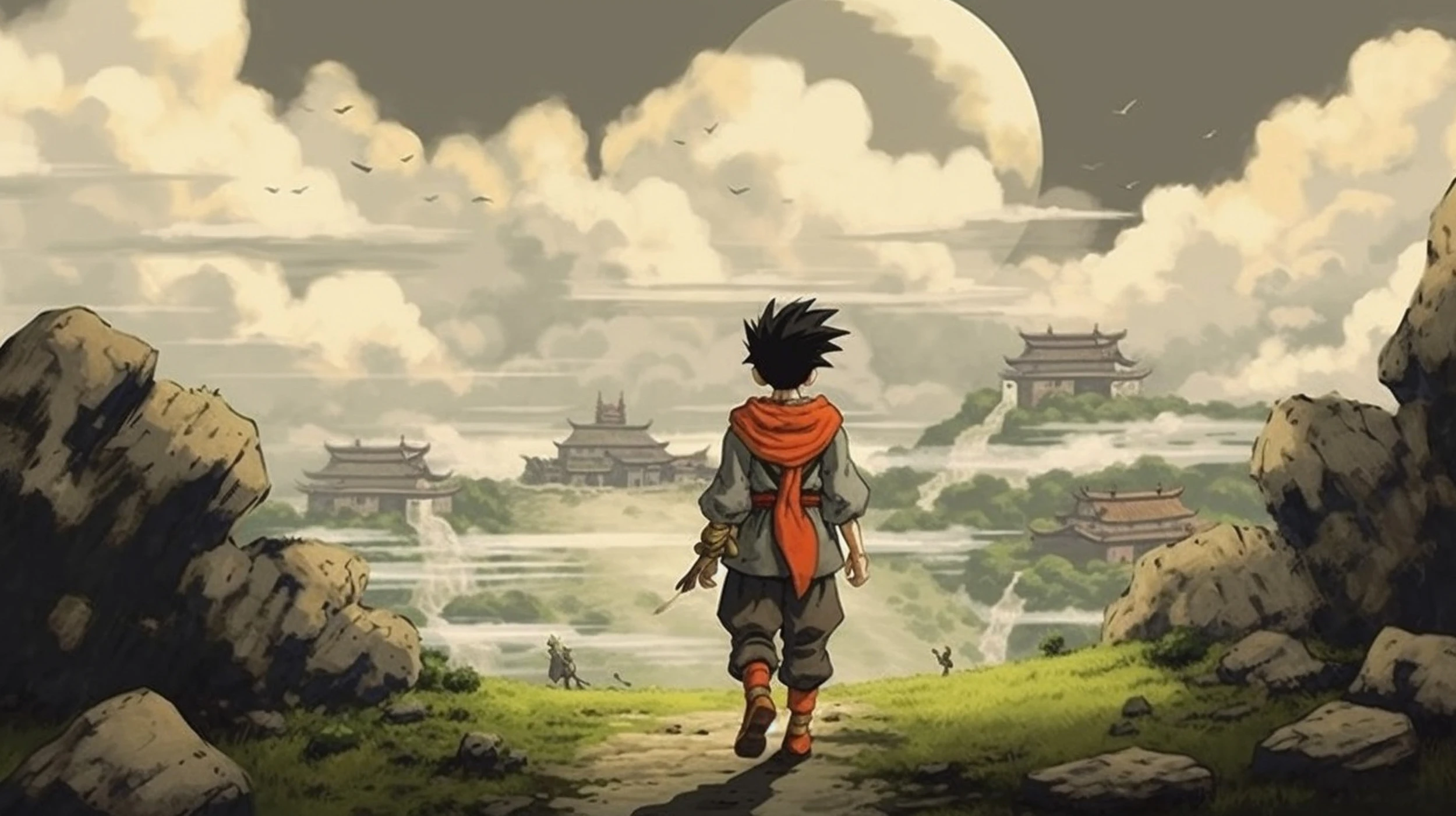 Cette œuvre murale d’exception révèle un paysage asiatique d’une beauté saisissante, dominé par l’architecture majestueuse de pagodes traditionnelles qui s’élèvent avec grâce dans un décor montagneux. Au premier plan, un personnage au style manga contemple cet univers grandiose, vêtu d’une cape rouge flamboyante qui contraste sublimement avec les tons sépia et ocre de l’ensemble. Les nuages volumineux sculptent le ciel dans une danse éternelle, tandis que des oiseaux en vol libre ponctuent cette composition d’une poésie aérienne.