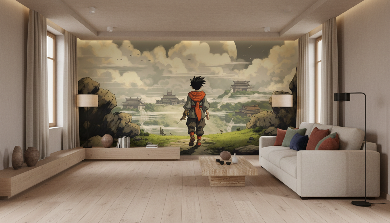 Harmonisez cette décoration murale asiatique avec des meubles en bois naturel, des textiles en lin écru ou en coton bio. Les accessoires en bambou, les luminaires japonais et les coussins aux tons terreux viendront parfaitement compléter cette ambiance feng shui. Osez les touches de rouge vermillon dans vos accessoires pour faire écho à la cape du personnage et créer une continuité visuelle saisissante.