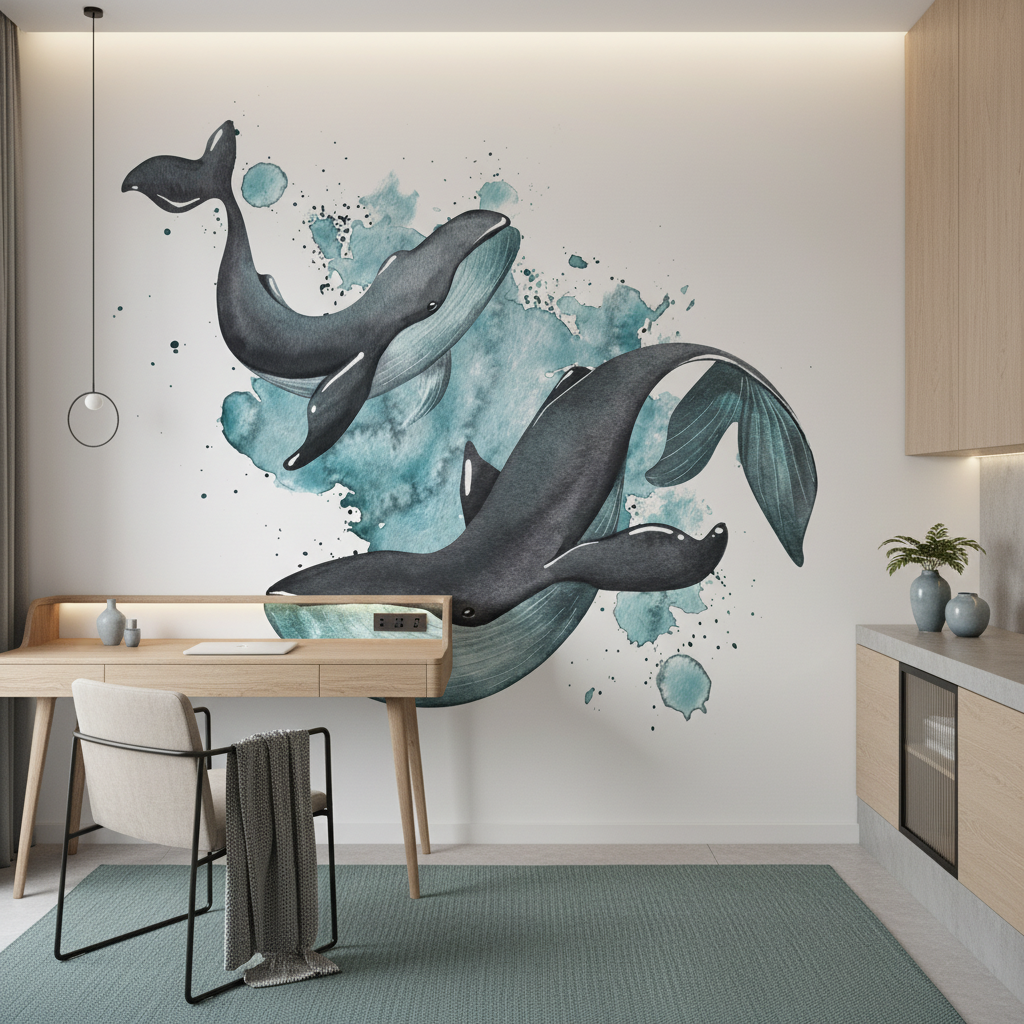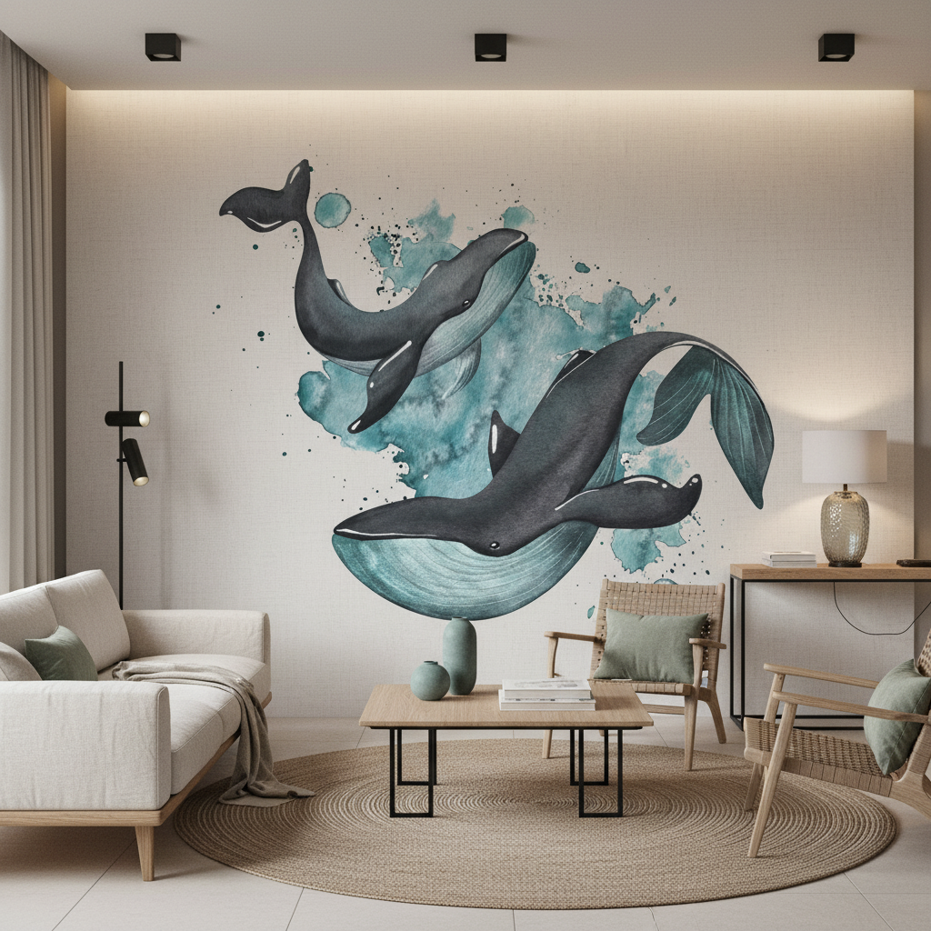 Ce papier peint aquarelle baleines capture l’essence même de la vie marine à travers un style artistique raffiné mêlant technique de l’aquarelle moderne et illustration naturaliste. Trois magnifiques cétacés aux silhouettes élégantes évoluent gracieusement dans un ballet aquatique, leurs corps puissants rendus dans des nuances de gris anthracite et de noir profond. Les ventres bleu turquoise aux délicates striures rappellent la texture authentique de ces mammifères marins, tandis que les éclaboussures d’eau cristalline créent un mouvement dynamique et poétique.