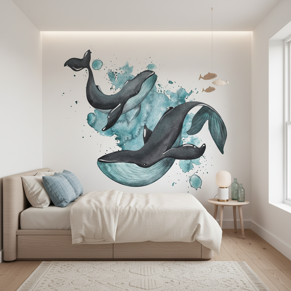 Laissez-vous emporter par la danse majestueuse des baleines dans cette œuvre aquatique où l’océan prend vie sous vos yeux, transformant votre intérieur en un sanctuaire marin d’une beauté saisissante.