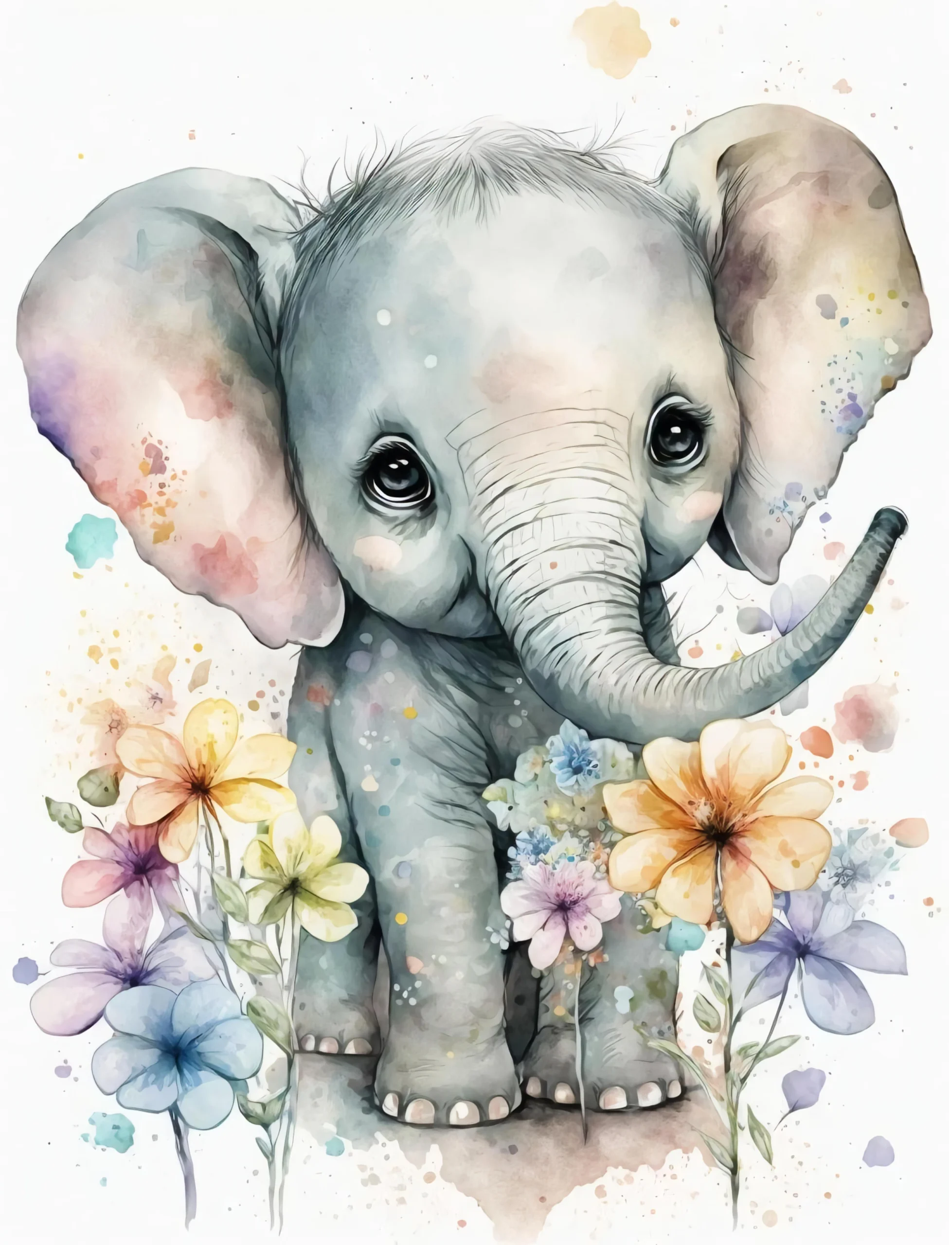 Cette illustration aquarelle révèle un adorable éléphanteau aux traits délicatement esquissés, dont les grandes oreilles colorées semblent danser dans un ballet de nuances pastel. L’artiste a sublimé cette créature attachante par une technique d’aquarelle moderne, où les éclaboussures colorées et les gouttes d’eau créent un effet de mouvement naturel et spontané. Les tons doux oscillent entre gris perle, bleus poudrés, roses tendres et ocres chaleureux, tandis que de délicates fleurs tropicales aux pétales translucides viennent caresser les pattes du petit pachyderme. Cette composition florale mêle hibiscus, plumeria et autres fleurs exotiques dans une harmonie de couleurs pastel qui évoque la douceur d’un jardin enchanté.