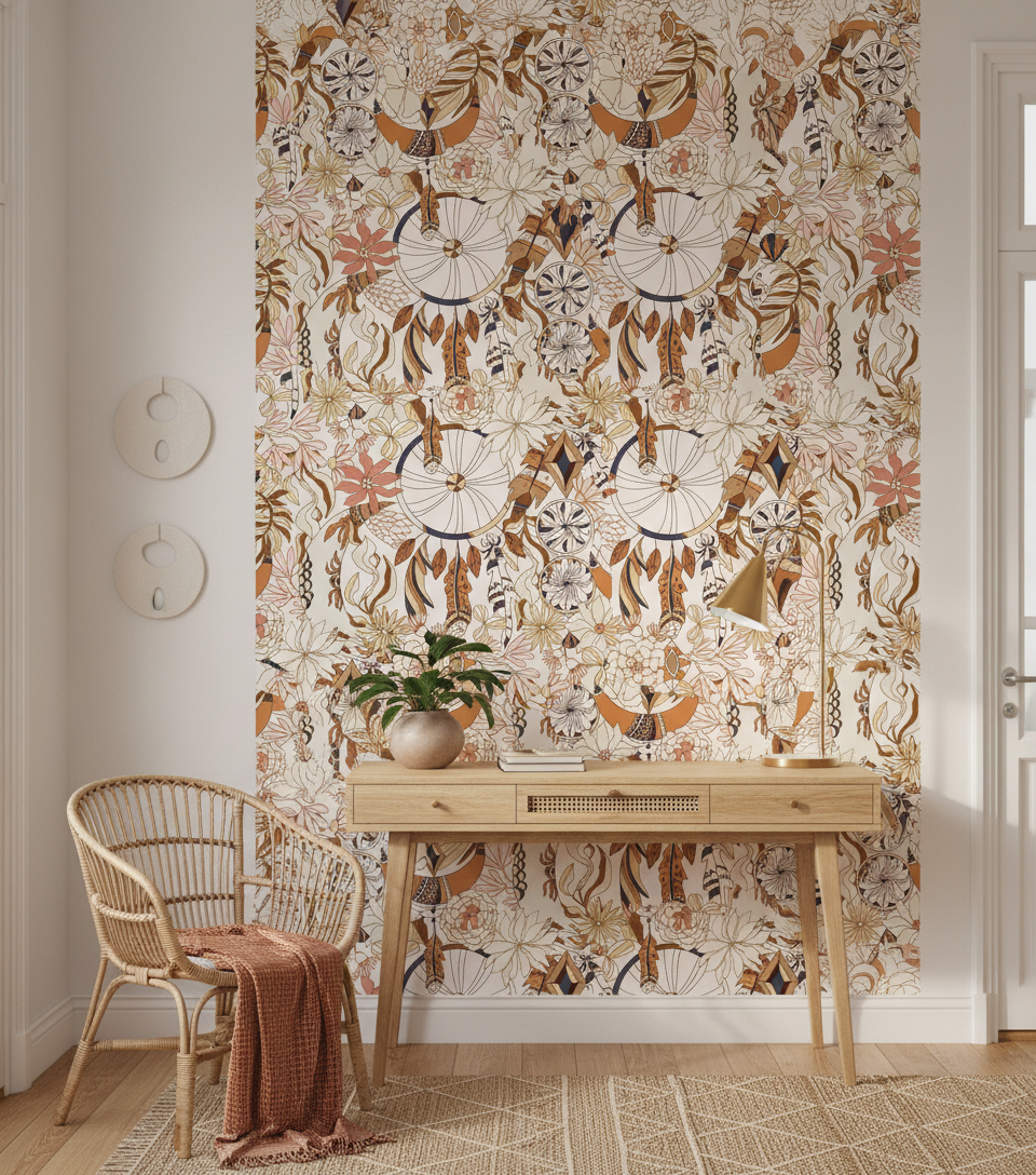 Ce papier peint bohème révèle un univers fascinant où les attrape-rêves aux motifs géométriques complexes côtoient une végétation stylisée d’une rare élégance. Les cercles ornementaux aux détails tribaux s’entremêlent avec des fleurs épanouies aux pétales délicatement dessinés, tandis que des feuillages tropicaux et des plumes ornementales viennent compléter cette composition artistique. Le style graphique, d’inspiration illustration botanique vintage, marie subtilement des influences ethniques et naturelles dans un rendu sophistiqué.