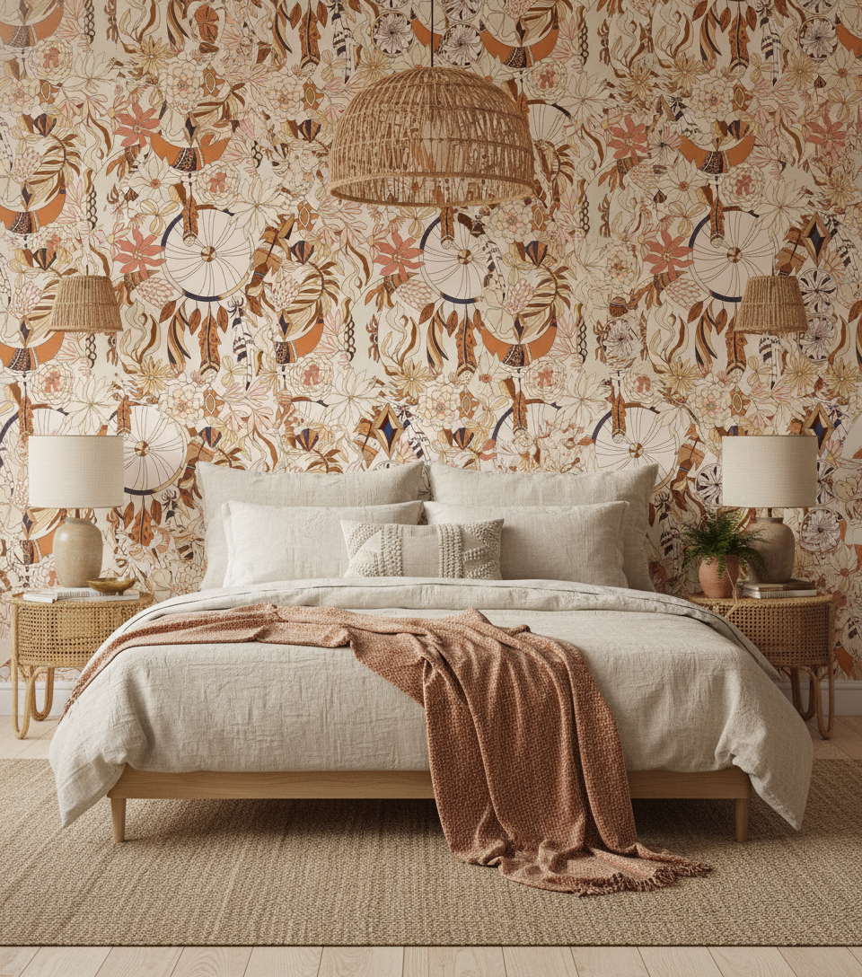 L’atmosphère créée par ce papier peint bohème chic transforme instantanément l’espace en un cocon mystique et chaleureux. Il dégage une sensation de sérénité spirituelle teintée d’un exotisme raffiné, invitant à la méditation et à l’évasion. Cette ambiance boho moderne apporte une dimension ethnique contemporaine qui réchauffe l’âme et stimule l’imagination.