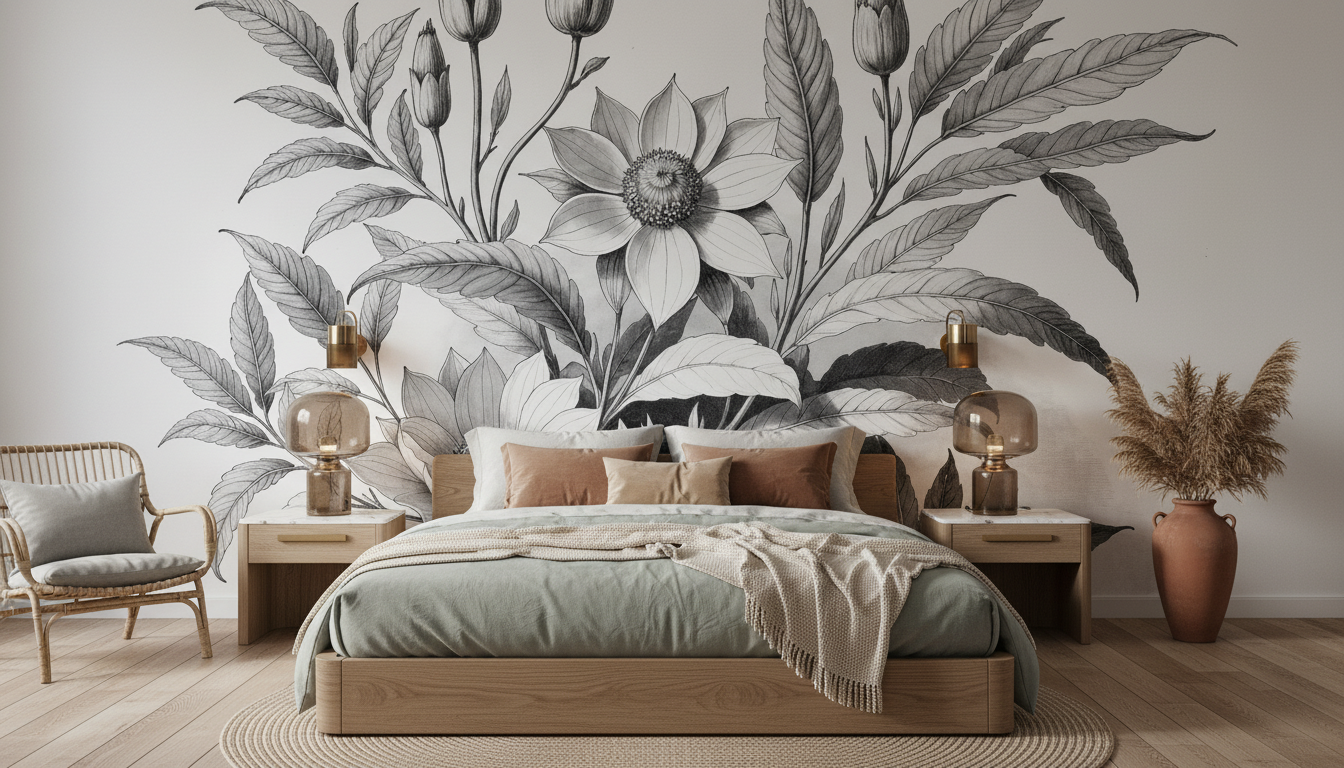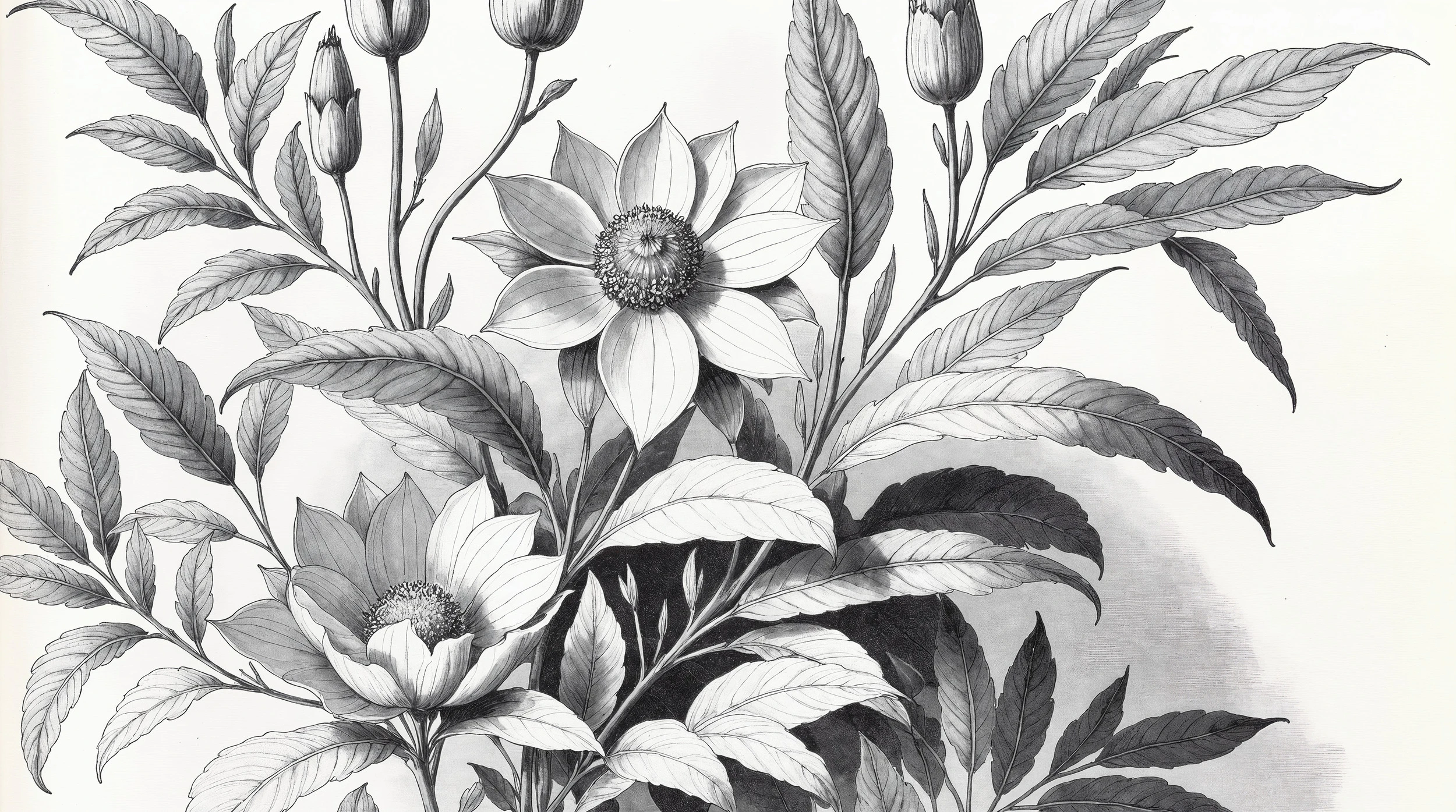 Papier Peint Jardin Botanique Noir et Blanc – Élégance Florale Intemporelle