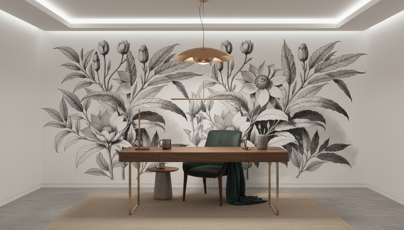 Pour un bureau créatif ou une bibliothèque, ce papier peint apporte une inspiration constante tout en préservant la concentration grâce à sa palette apaisante.