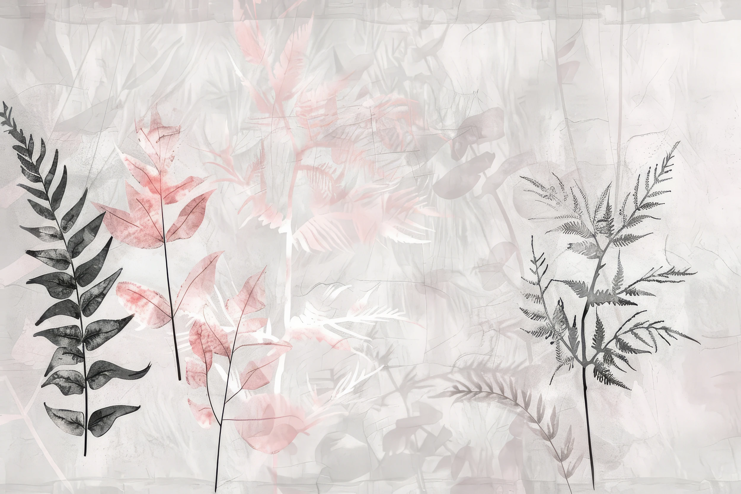 Ce papier peint botanical dévoile une composition raffinée mêlant végétation stylisée et motifs botaniques délicats. Les feuillages graphiques se déploient avec élégance : fougères finement ciselées aux nervures précises, branches aux feuilles ovales d’un noir profond, et branchages aériens aux teintes rosées qui semblent flotter dans l’espace. Le style aquarelle moderne confère à l’ensemble une dimension artistique unique, où chaque élément végétal se détache sur un fond poudré aux nuances subtiles.