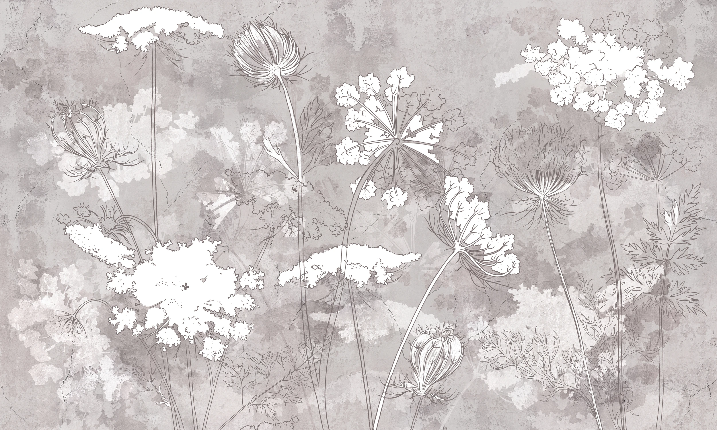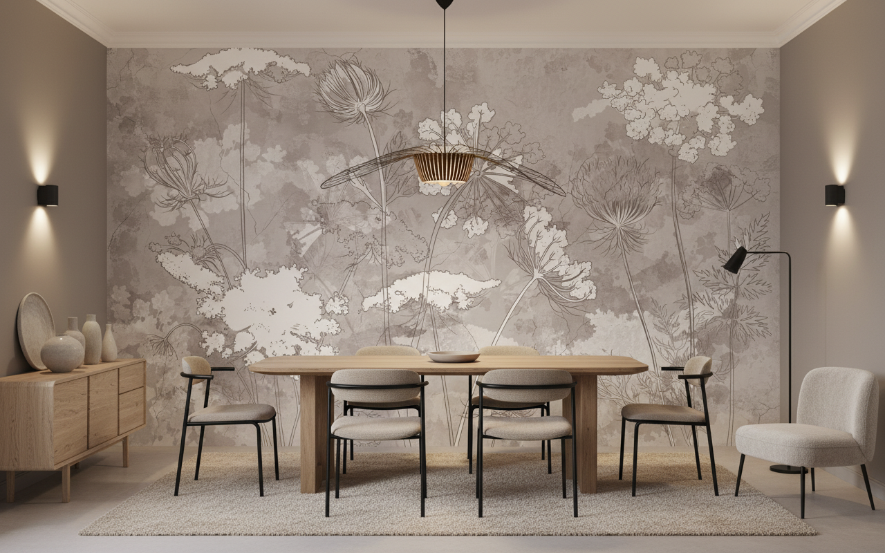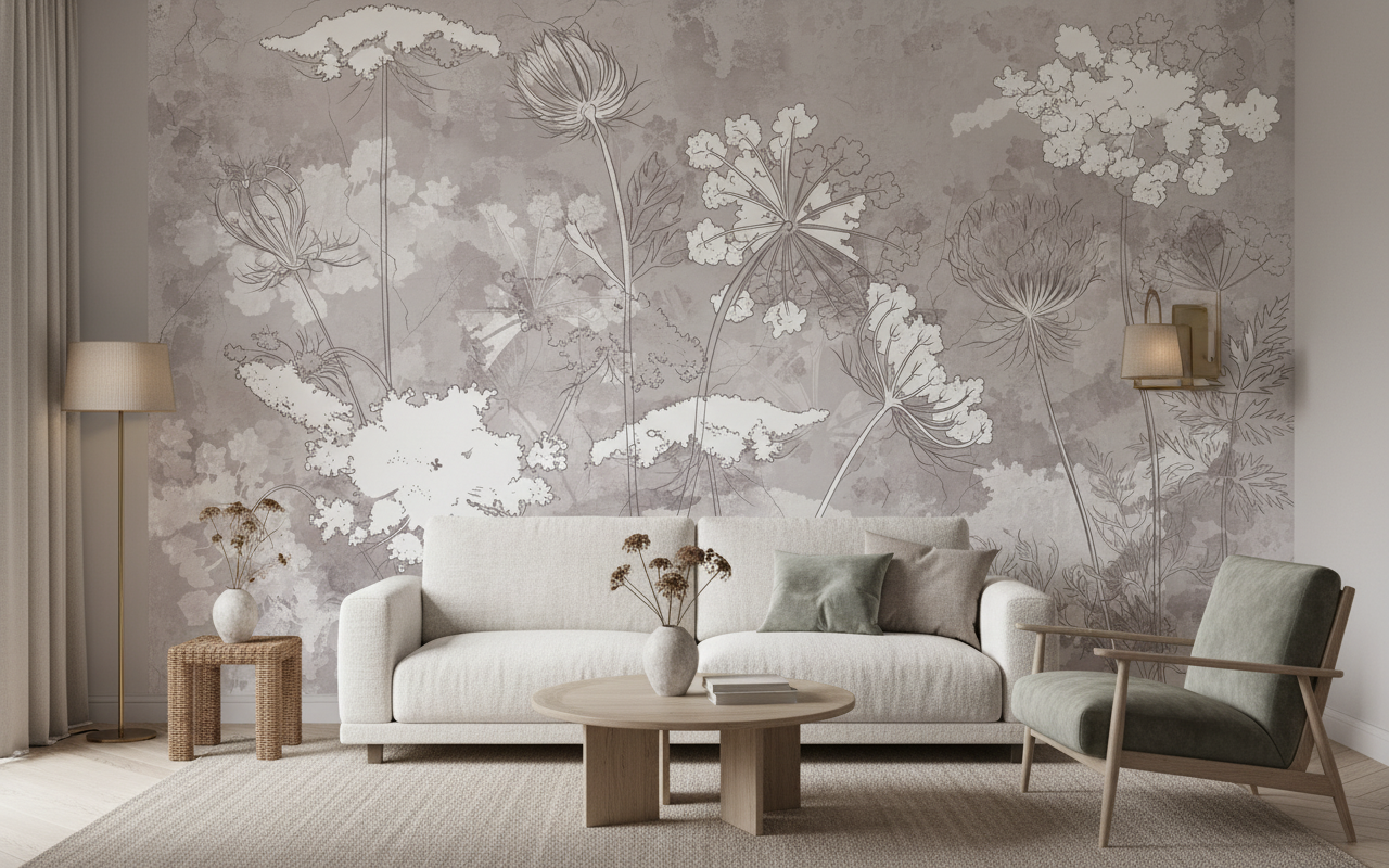 Cette création artistique exceptionnelle révèle un univers végétal d’une finesse remarquable, où les ombelles gracieuses s’épanouissent sur un fond texturé aux nuances poudrées. Le style graphique au trait s’apparente aux plus belles planches botaniques d’antan, alliant la précision scientifique à une sensibilité artistique contemporaine. Les inflorescences délicates se déploient dans une danse aérienne, certaines représentées par de fins contours linéaires, d’autres sublimées par des masses florales blanches qui semblent flotter sur la surface murale comme des nuages cotonneux.