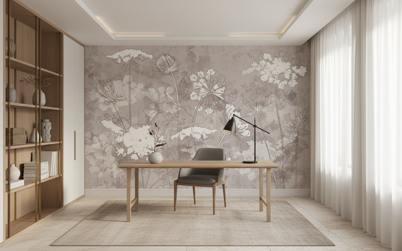 Pour un bureau à domicile, cette tapisserie florale stimulera la créativité tout en maintenant une atmosphère sereine propice à la concentration. Les tons neutres permettent d’intégrer facilement des touches de couleur par le biais d’œuvres d’art ou de plantes vertes qui créeront un dialogue harmonieux avec les motifs botaniques du papier peint.