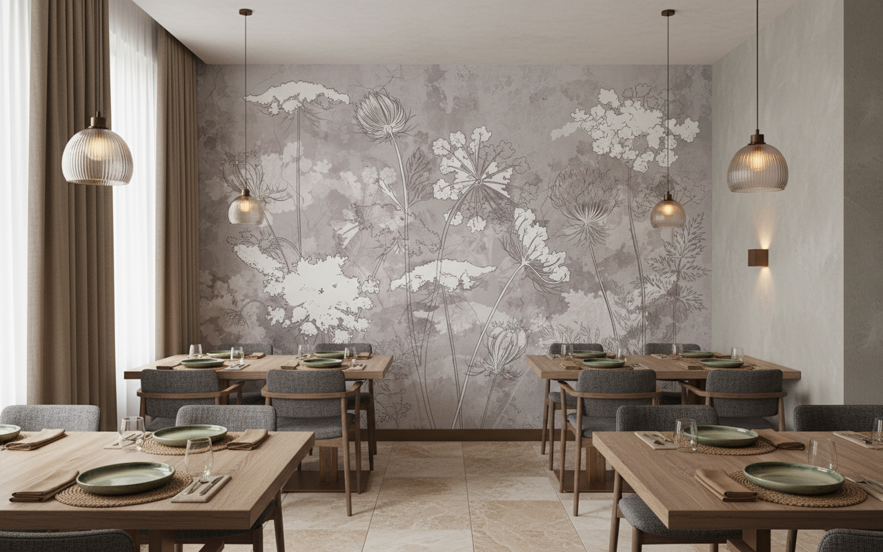 L’atmosphère qui émane de ce revêtement mural floral est d’une sérénité absolue. Il transforme instantanément l’espace en un cocon apaisant, propice à la contemplation et au bien-être. Cette décoration murale nature crée une ambiance feutrée, presque méditative, où chaque regard porté sur les motifs révèle de nouveaux détails botaniques à admirer. La sensation qui s’en dégage évoque les premières lueurs de l’aube dans une prairie fleurie, lorsque la rosée matinale nimbe les végétaux d’une lumière tendre.