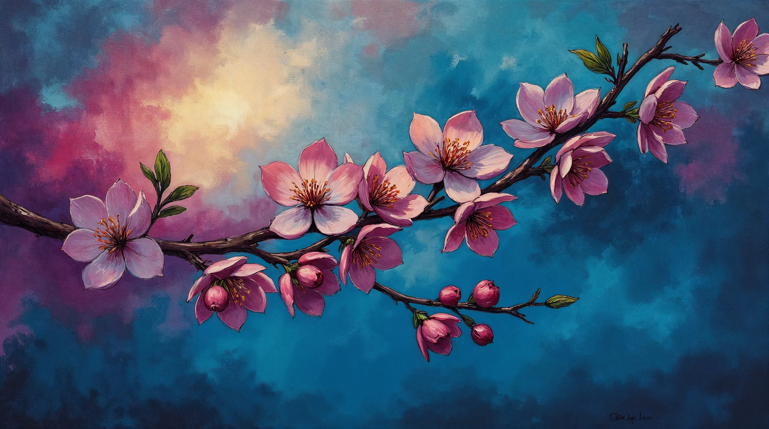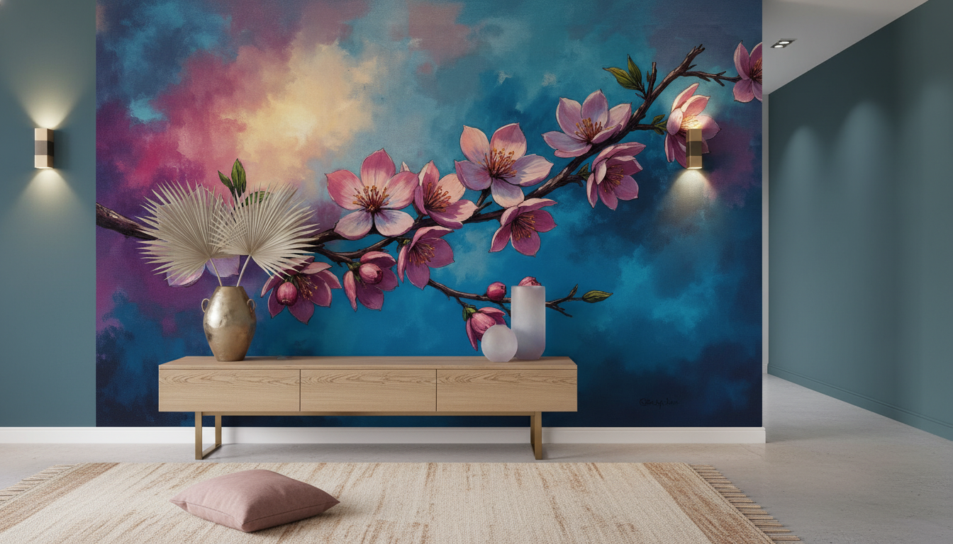 Dans un écrin de brumes colorées où se mêlent les teintes poudrées du crépuscule, une branche de cerisier en fleurs déploie sa grâce poétique contre un ciel aux nuances infinies. Cette œuvre murale capture l’essence même du renouveau printanier, transformant votre intérieur en un refuge contemplatif où chaque regard devient une invitation au voyage.