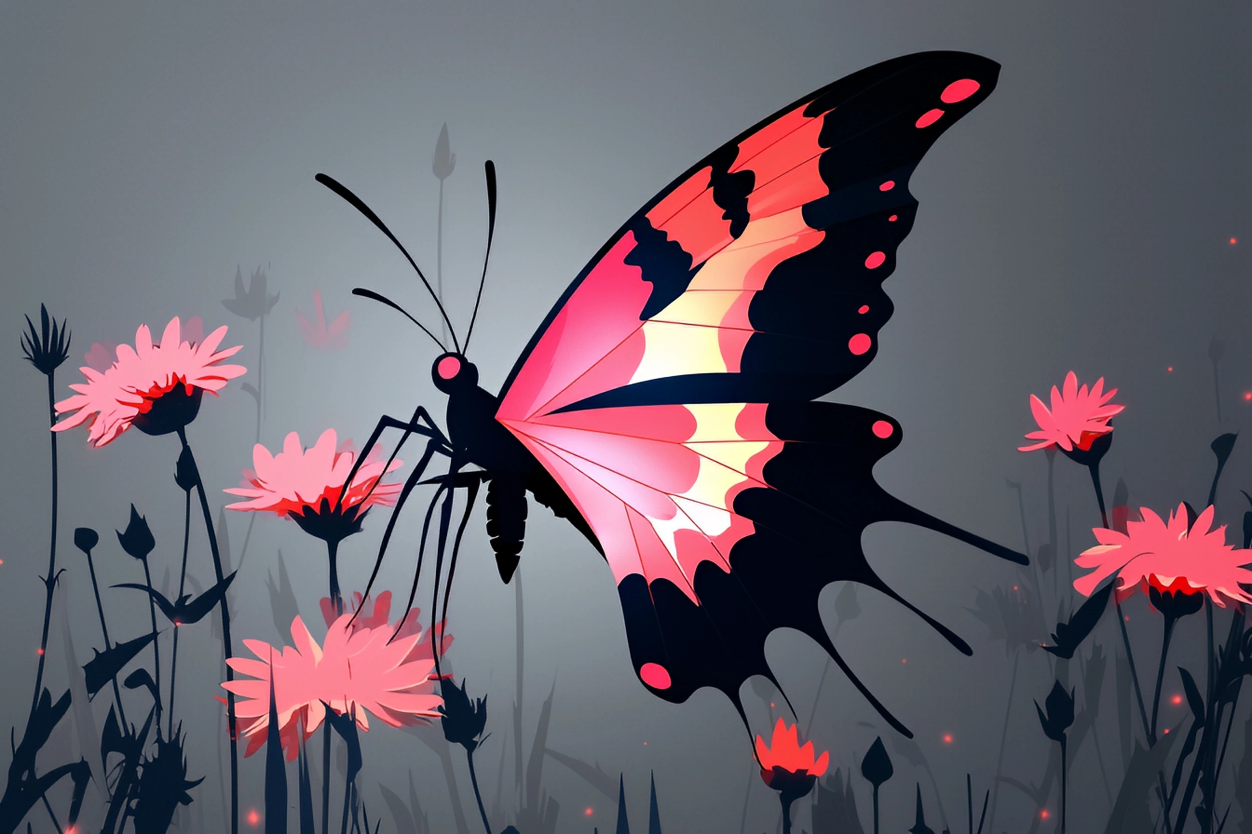 Ce papier peint nature exceptionnel met en scène un majestueux papillon aux ailes corail qui semble s’élever dans un ballet aérien au cœur d’un jardin fantastique. Ses ailes délicatement ourlées de noir révèlent un dégradé fascinant de roses corail, de saumon lumineux et de touches dorées, créant un contraste saisissant avec la silhouette sombre et élégante de son corps. Autour de cette créature enchanteresse, des fleurs stylisées aux pétales roses émergent de tiges élancées, leurs corolles s’épanouissant comme des étoiles dans cette atmosphère brumeuse. Le style graphique contemporain de cette œuvre mêle subtilement réalisme et stylisation, rappelant les plus belles illustrations botaniques modernes.