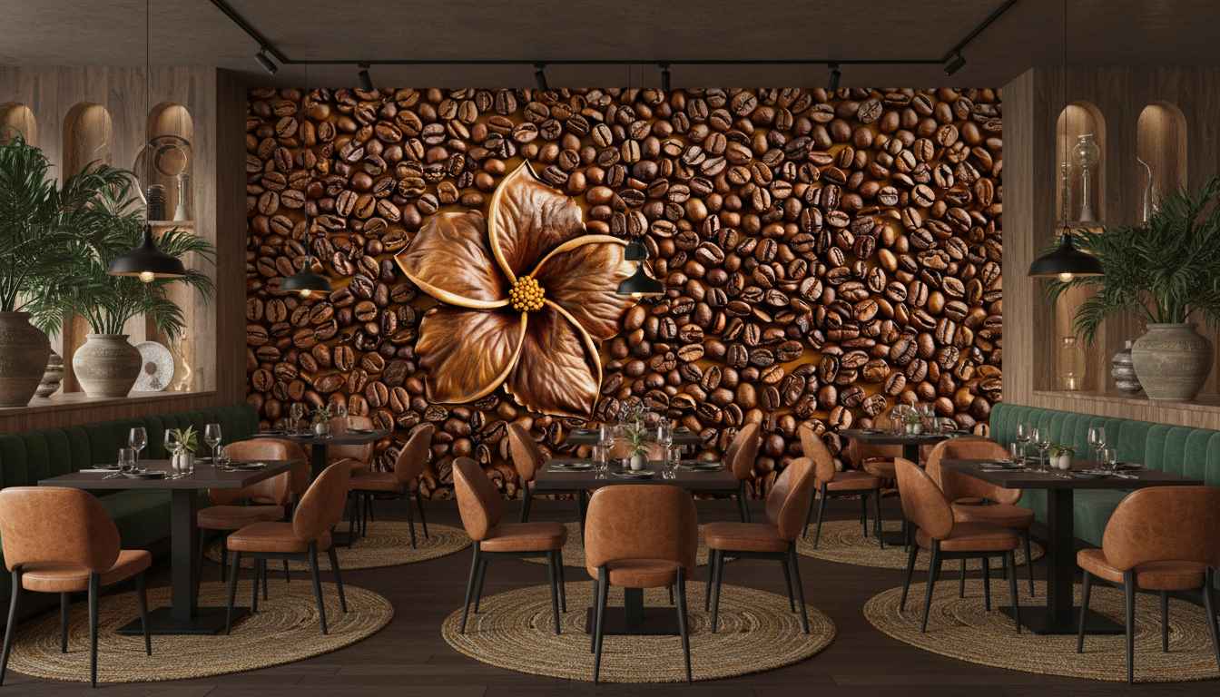 Plongez dans un décor mural gourmand et chaleureux. Grains de café torréfiés ultra-réalistes et élégante fleur tropicale. Idéal pour une cuisine moderne, un salon cosy ou un bureau. Créez une ambiance « coffee shop chic » sur mesure.