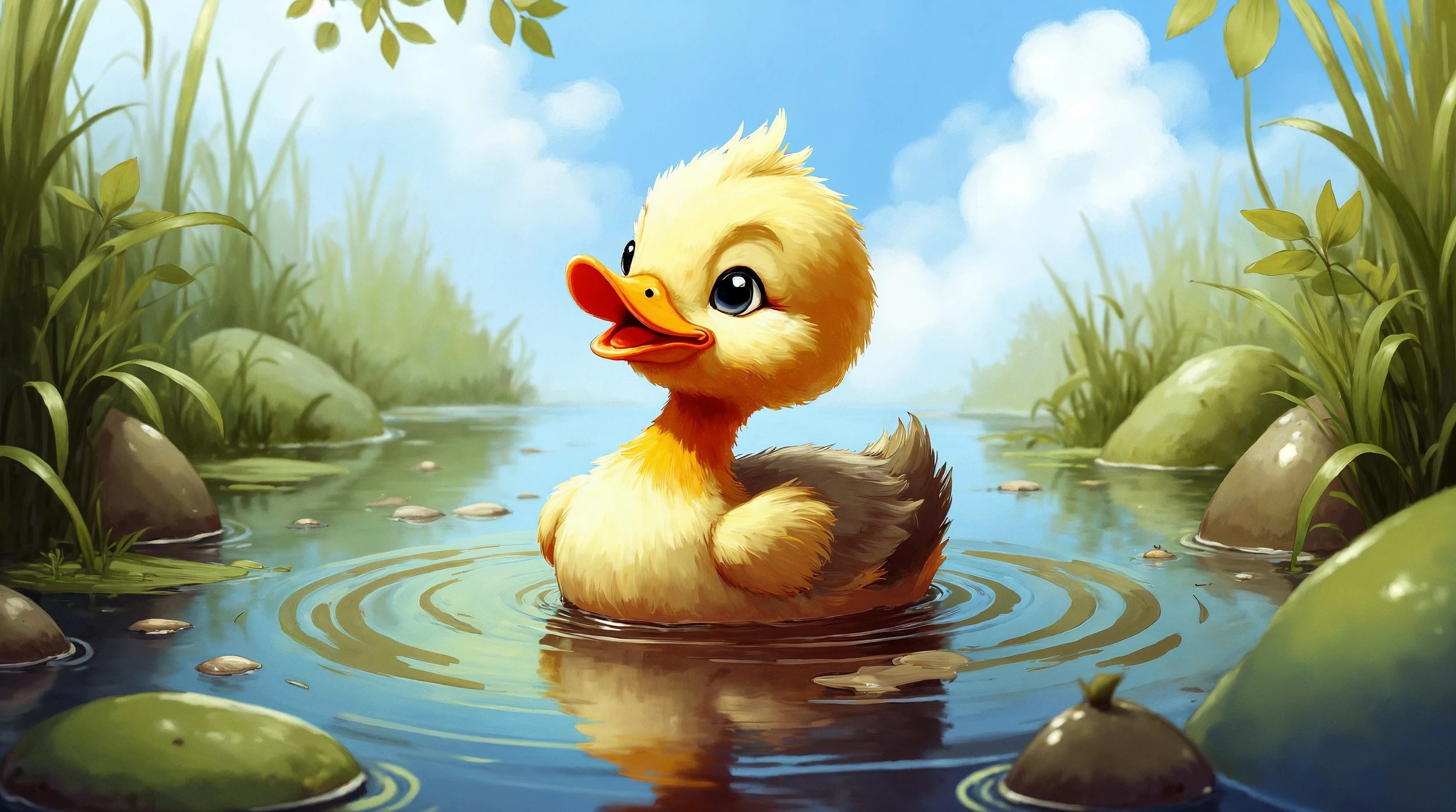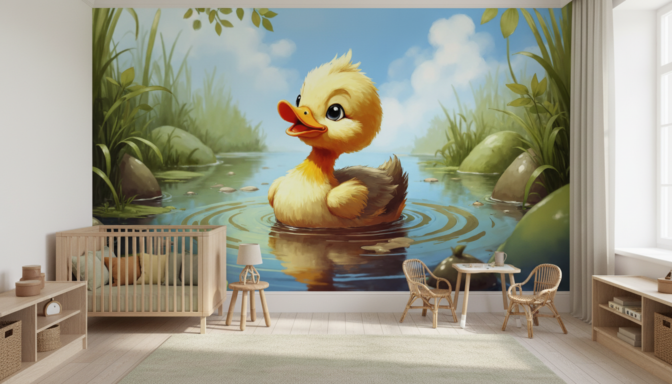 Ce papier peint animalier met en scène un adorable caneton doré naviguant avec grâce sur les eaux cristallines d’un petit bassin naturel. L’illustration, réalisée dans un style aquarelle numérique d’une finesse remarquable, révèle chaque détail avec une précision artistique saisissante : le plumage duveteux aux reflets dorés, les ondulations délicates créées par le passage du jeune palmipède, et son regard pétillant de malice. L’environnement luxuriant déploie une végétation aquatique foisonnante, parsemée de roseaux verts, de mousses tendres et de pierres polies par l’eau. Le ciel bleu azur ponctué de nuages cotonneux apporte une luminosité naturelle qui baigne toute la composition dans une atmosphère sereine.
