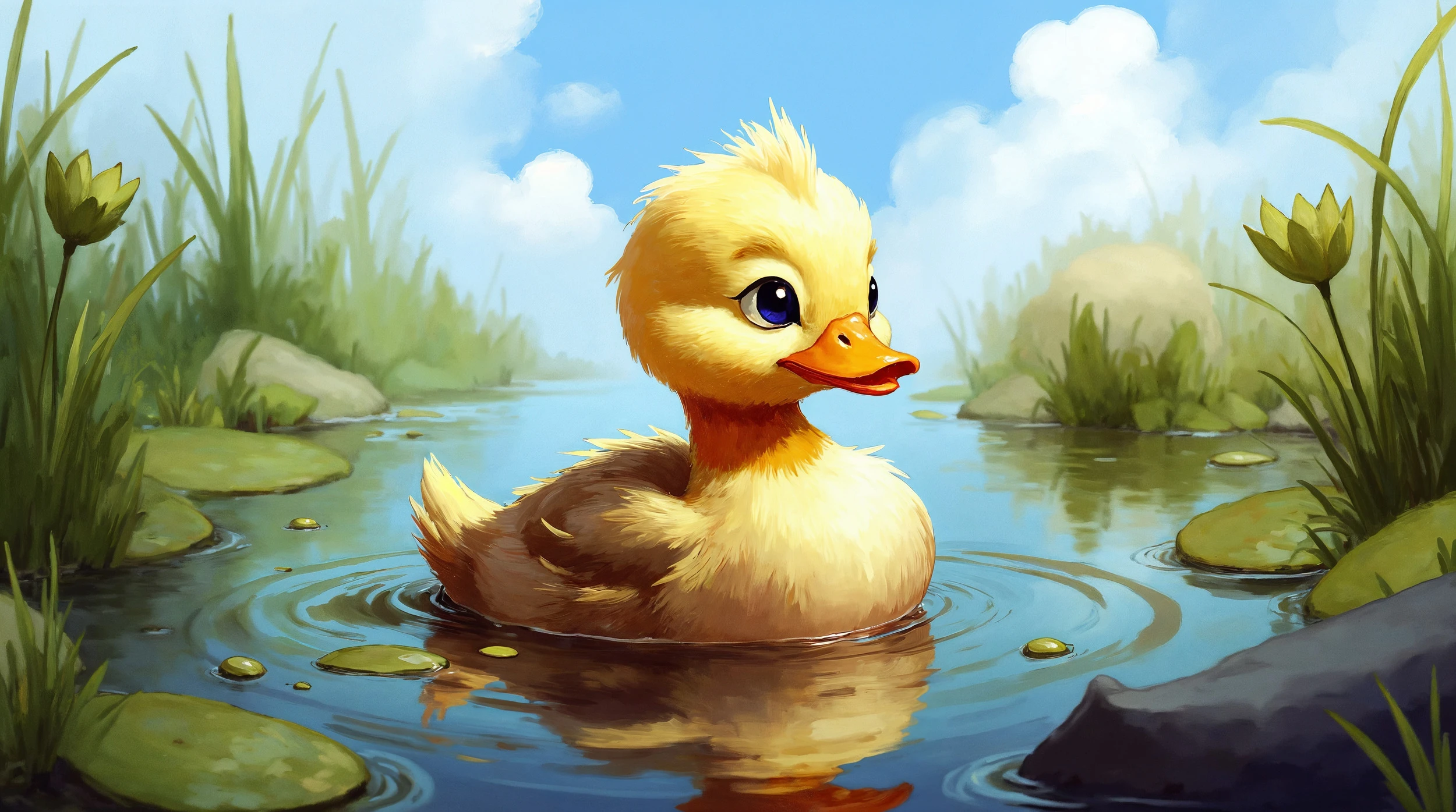 Au centre de cette composition enchantée, un petit caneton aux plumes dorées navigue gracieusement sur les eaux cristallines, ses grands yeux bleus pétillants de malice et de curiosité. Son duvet jaune orangé contraste harmonieusement avec les nuances plus sombres de ses ailes naissantes, créant un jeu de textures d’un réalisme saisissant. Autour de lui, un écosystème aquatique luxuriant se déploie : des nénuphars aux feuilles vert tendre flottent paresseusement à la surface, tandis que des roseaux élancés et des herbes aquatiques encadrent délicatement la scène.