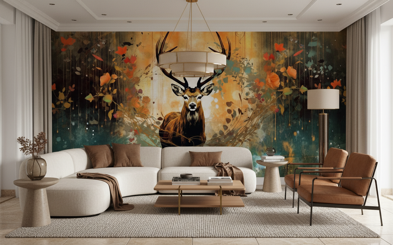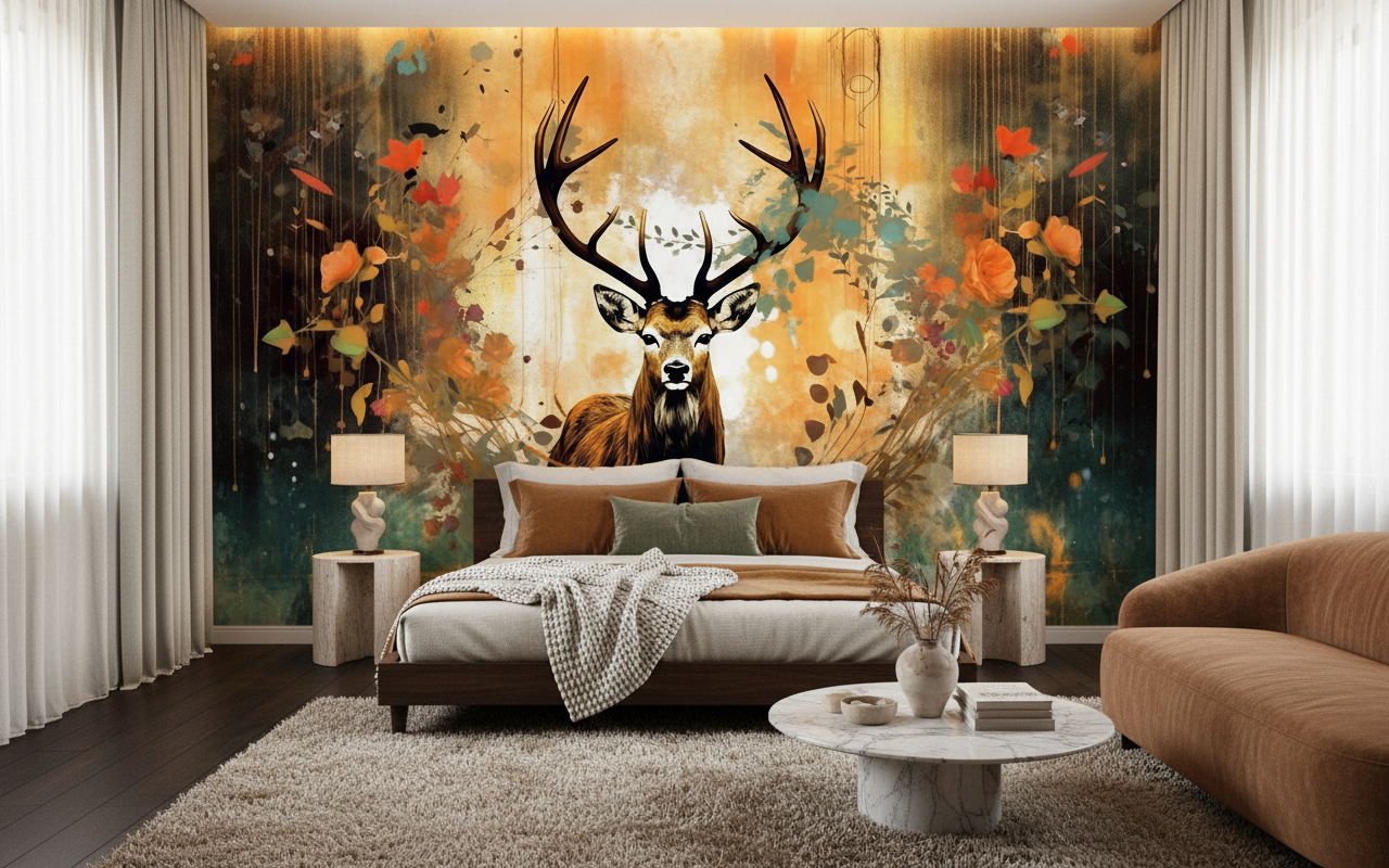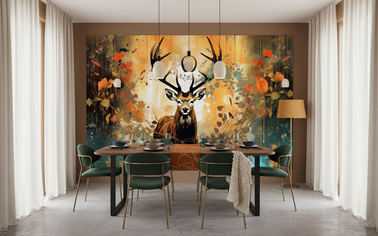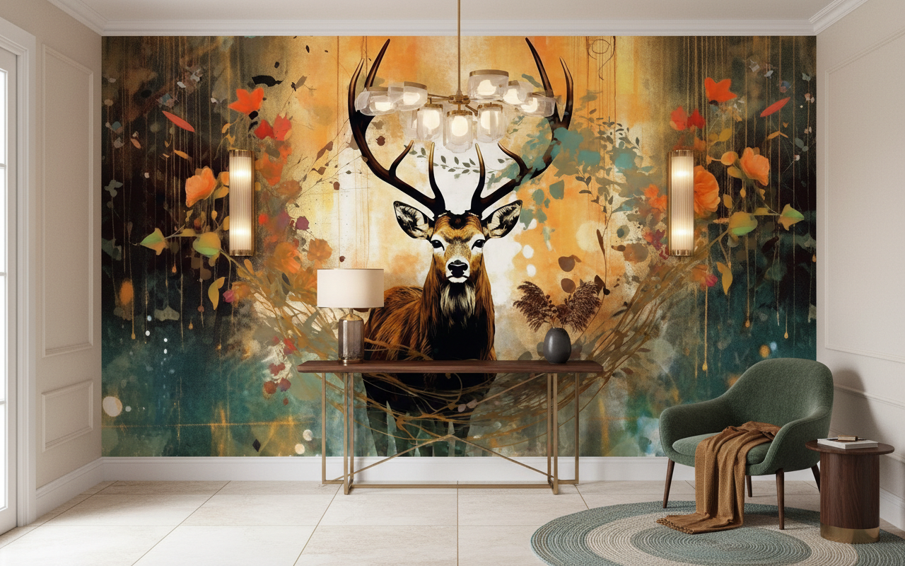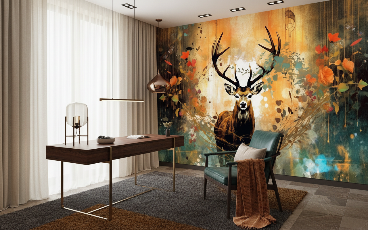 Cette fresque murale artistique transforme instantanément l’atmosphère d’un intérieur en y insufflant une énergie forestière teintée de mystère et de noblesse. L’ambiance qui s’en dégage évoque les légendes celtiques et les contes d’automne, créant un cocon chaleureux propice à la contemplation et à l’évasion. La présence du cerf, symbole de sagesse et de renaissance, apporte une dimension spirituelle qui invite à la sérénité.