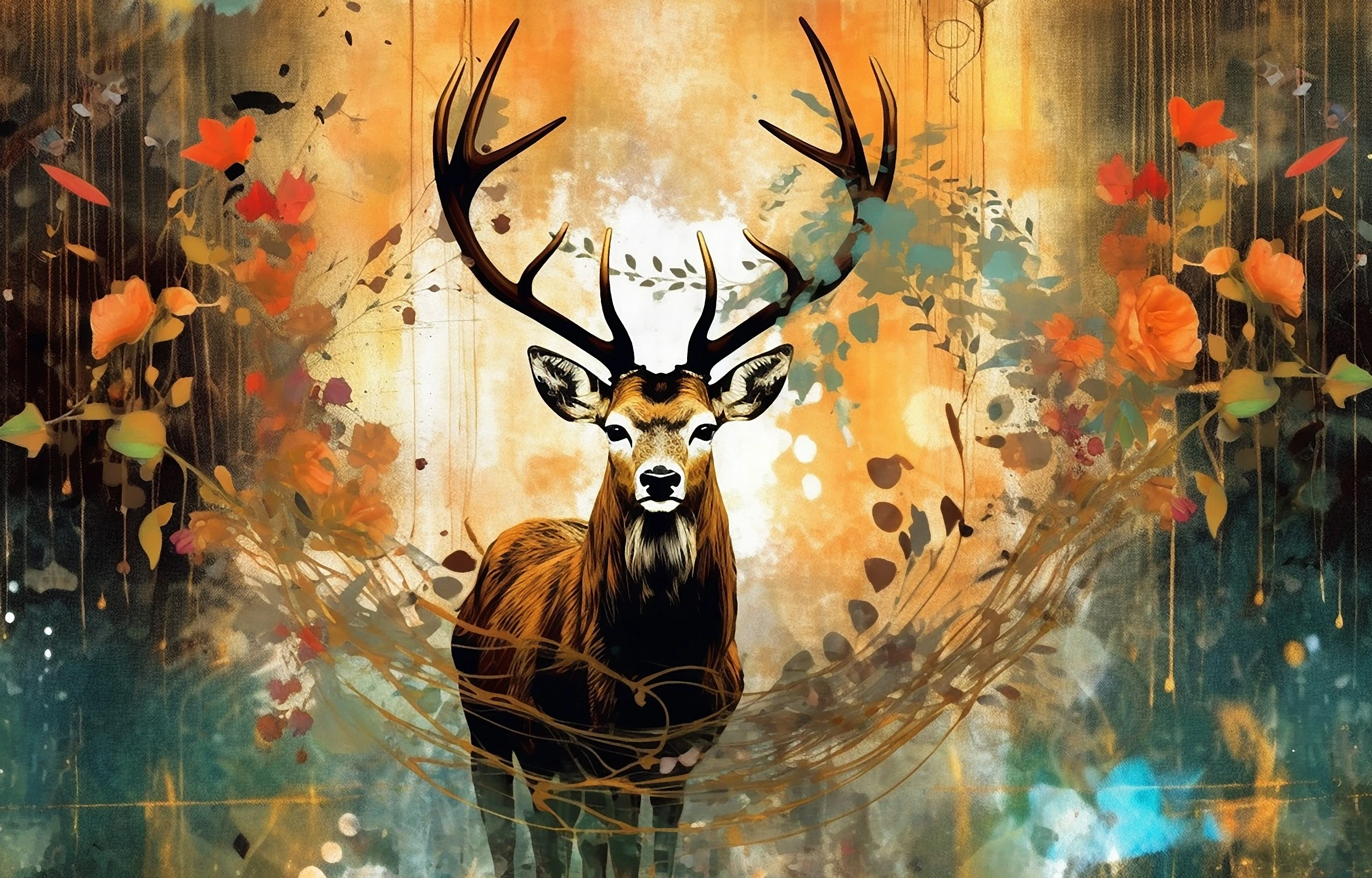 Ce papier peint artistique capture l’essence même de la nature sauvage à travers un style pictural contemporain aux accents street art. Le cerf majestueux, figure centrale de cette œuvre, se détache avec une présence saisissante sur un fond abstrait où se mêlent éclaboussures colorées et coulures artistiques. Les tons chauds automnaux – orange cuivré, ocre doré, rouge vermillon – s’harmonisent avec des nuances de vert jade et de brun chocolat, créant une palette chromatique d’une richesse exceptionnelle.
