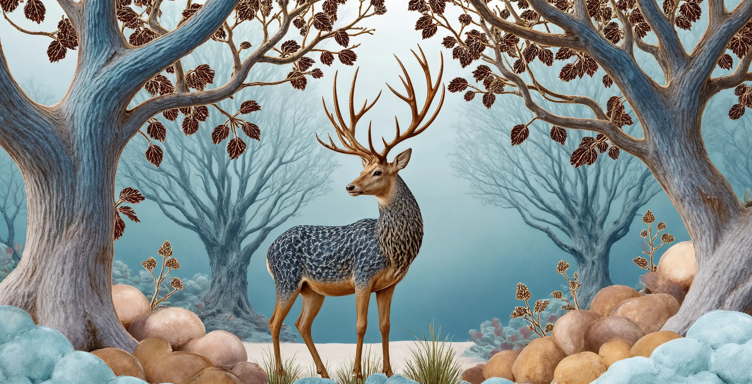 Ce papier peint animalier d’exception capture l’essence poétique d’une scène sylvestre sublimée par un traitement artistique raffiné. Au cœur de la composition, un cerf aux ramures imposantes au pelage délicatement moucheté se détache sur un paysage hivernal aux tonalités douces. Les arbres dénudés aux silhouettes élégantes encadrent la scène, leurs branches entrelacées créant une voûte naturelle ornée de feuillages automnaux aux nuances cuivrées et mordorées. Des rochers arrondis aux teintes ocre et beige parsèment le sol, tandis que quelques brins d’herbes sauvages et plantes séchées apportent une touche de délicatesse botanique.