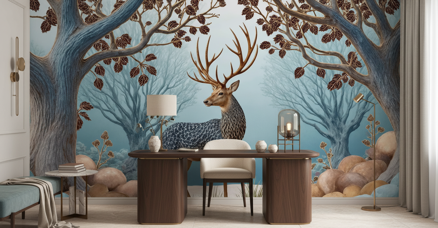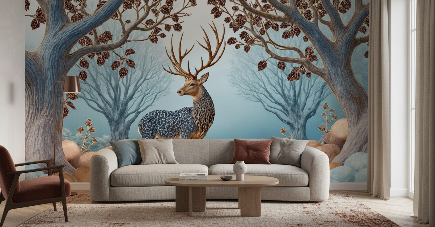 La palette chromatique de ce papier peint nature privilégie les tons neutres apaisants : bleus poudrés, gris perle, beiges chaleureux et bruns profonds se marient harmonieusement pour créer une atmosphère zen et contemplative. Le style graphique, d’inspiration nordique contemporaine, mélange subtilement réalisme et stylisation, conférant à cette fresque murale une dimension artistique exceptionnelle.