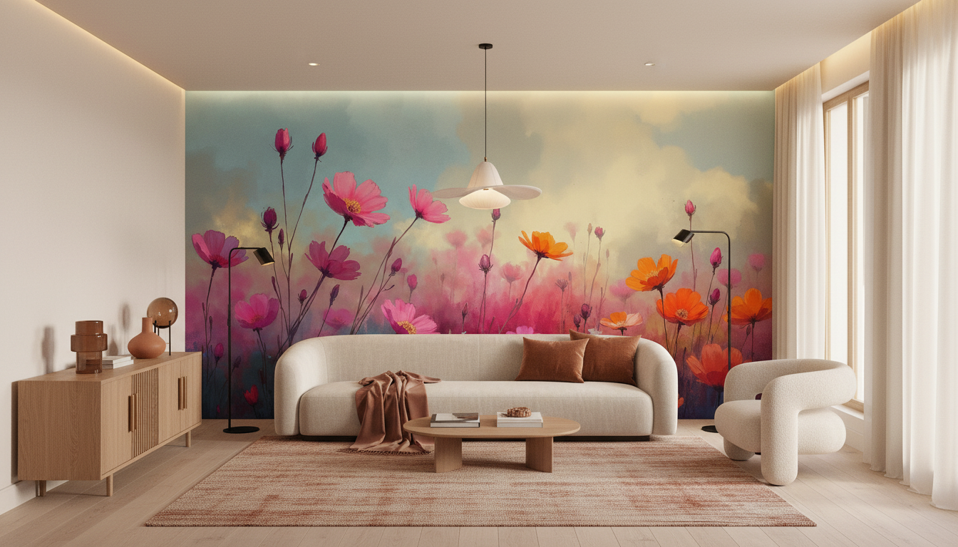Imaginez un souffle poétique caressant votre intérieur, où s’épanouissent dans une symphonie colorée des cosmos sauvages aux teintes vibrantes, créant une atmosphère d’évasion absolue dans votre espace de vie.