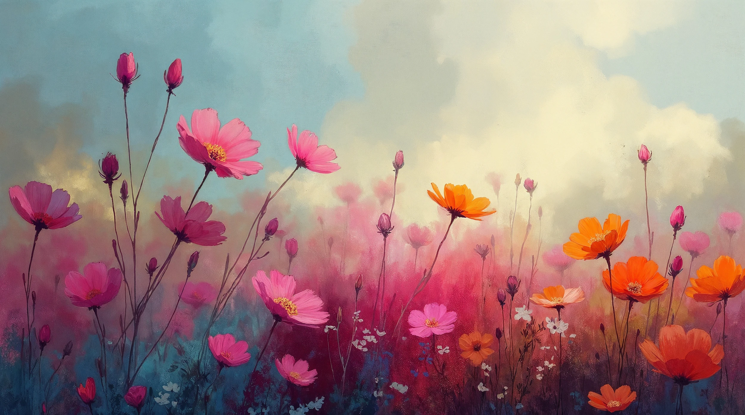 La technique picturale employée évoque l’art de l’aquarelle moderne, avec ses contours légèrement floutés et ses couleurs qui semblent se fondre naturellement les unes dans les autres. Les tiges élancées et les boutons floraux créent un rythme vertical dynamique, tandis que la présence de petites fleurs blanches apporte une touche de délicatesse supplémentaire à cette composition florale sophistiquée.