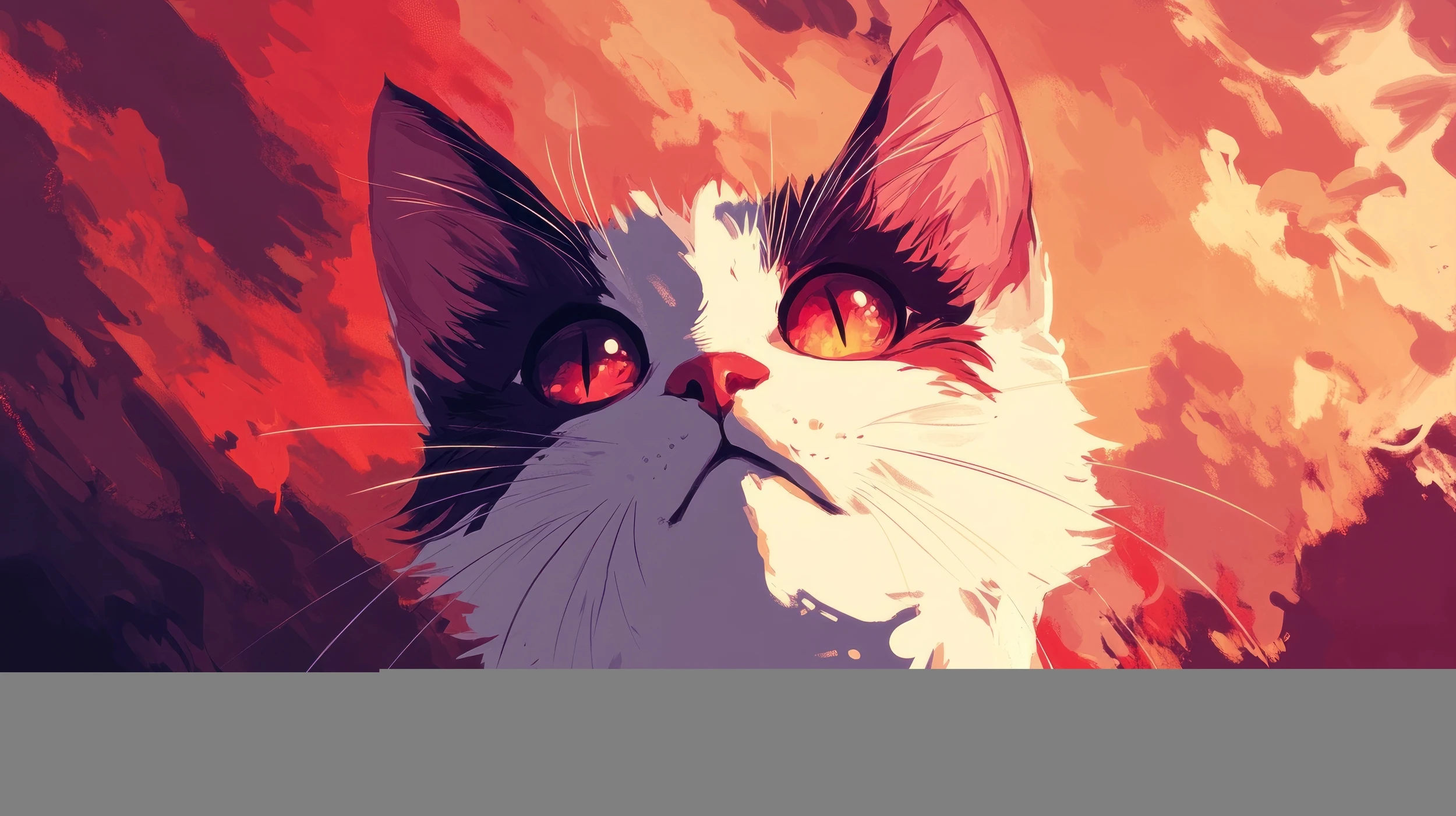 La palette chromatique se déploie dans un camaïeu de rouges flamboyants, d’oranges cuivrés et de jaunes dorés, rappelant les nuances d’un ciel embrasé. Cette dominante chaude s’équilibre parfaitement avec les zones d’ombre pourpres et les rehauts de blanc pur qui sculptent la silhouette féline avec une précision artistique saisissante.