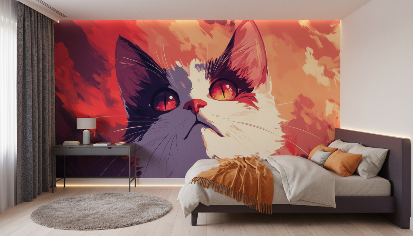Ce papier peint artistique révèle le portrait saisissant d’un chat aux yeux flamboyants, dont le pelage noir et blanc contraste magnifiquement avec un arrière-plan aux tons chauds orangés et rouges. Le style graphique, inspiré de l’illustration digitale moderne, marie avec brio les techniques de peinture contemporaine et l’esthétique du pop art animalier. Les yeux ambres lumineux de ce félin captivant semblent capter toute la lumière de la pièce, créant un point focal d’une intensité remarquable.