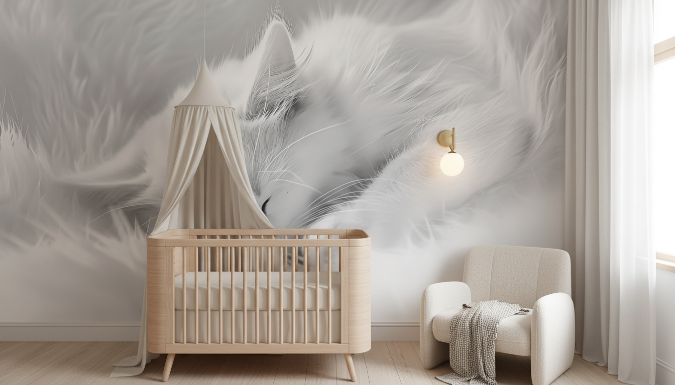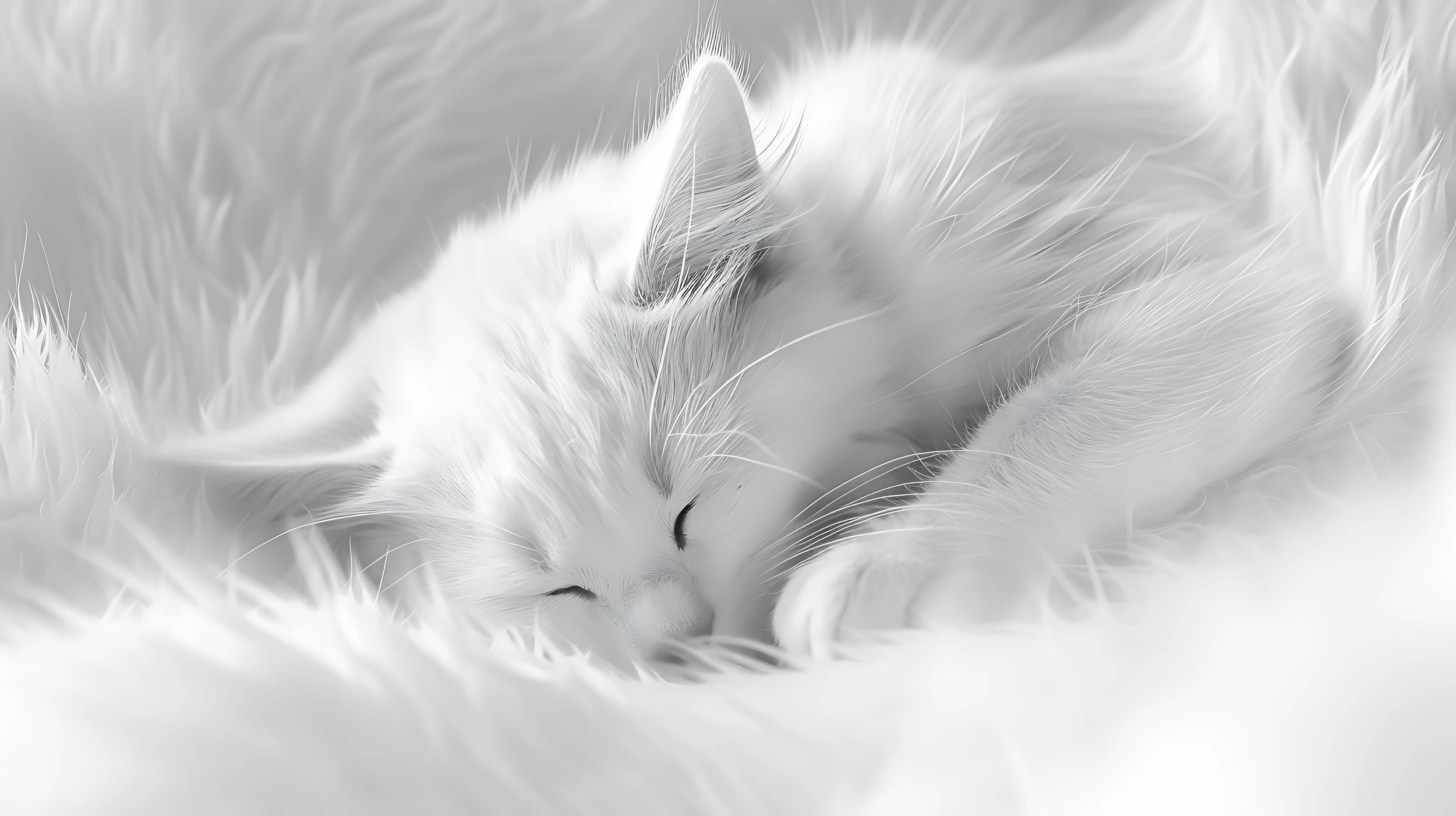 Ce papier peint chat révèle le portrait attendrissant d’un chaton endormi, niché dans un cocon de fourrure soyeuse aux reflets nacrés. L’image, d’un réalisme photographique époustouflant, dévoile chaque détail avec une précision artistique remarquable : les vibrisses délicates qui s’étirent comme des fils de soie, les paupières closes dans un sommeil paisible, et cette texture pelucheuse qui semble presque palpable. Le style photographique en monochrome sublime les nuances subtiles du gris perle au blanc immaculé, créant un dégradé d’une élégance intemporelle.