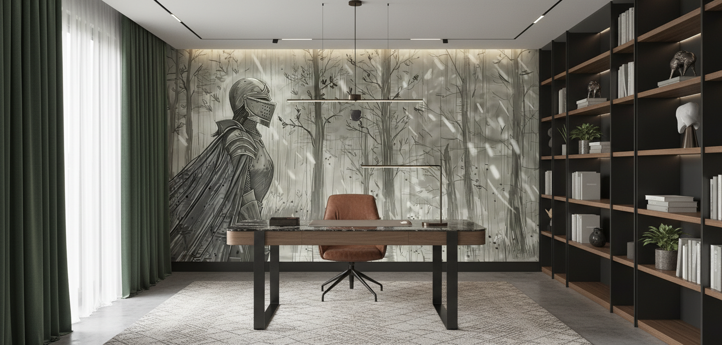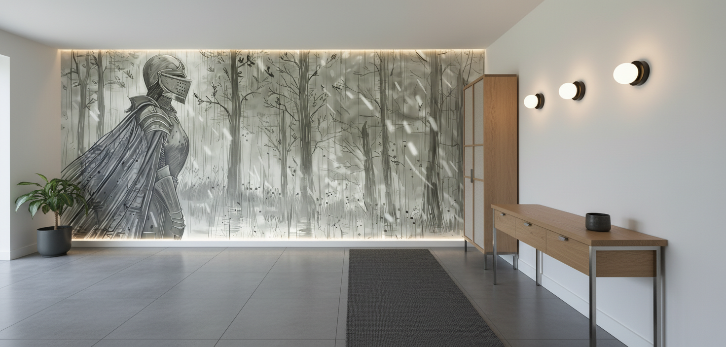 Ce papier peint artistique trouvera sa place idéale dans un bureau sophistiqué, une bibliothèque ou encore une chambre parentale en quête de caractère. Pour sublimer cette œuvre graphique, associez-la à du mobilier en bois sombre, des textiles en lin brut dans des teintes naturelles, et des accessoires en laiton vieilli. Les tons terre et les matières authentiques comme le cuir patiné ou la pierre naturelle créeront un dialogue harmonieux avec cette esthétique médiévale raffinée.