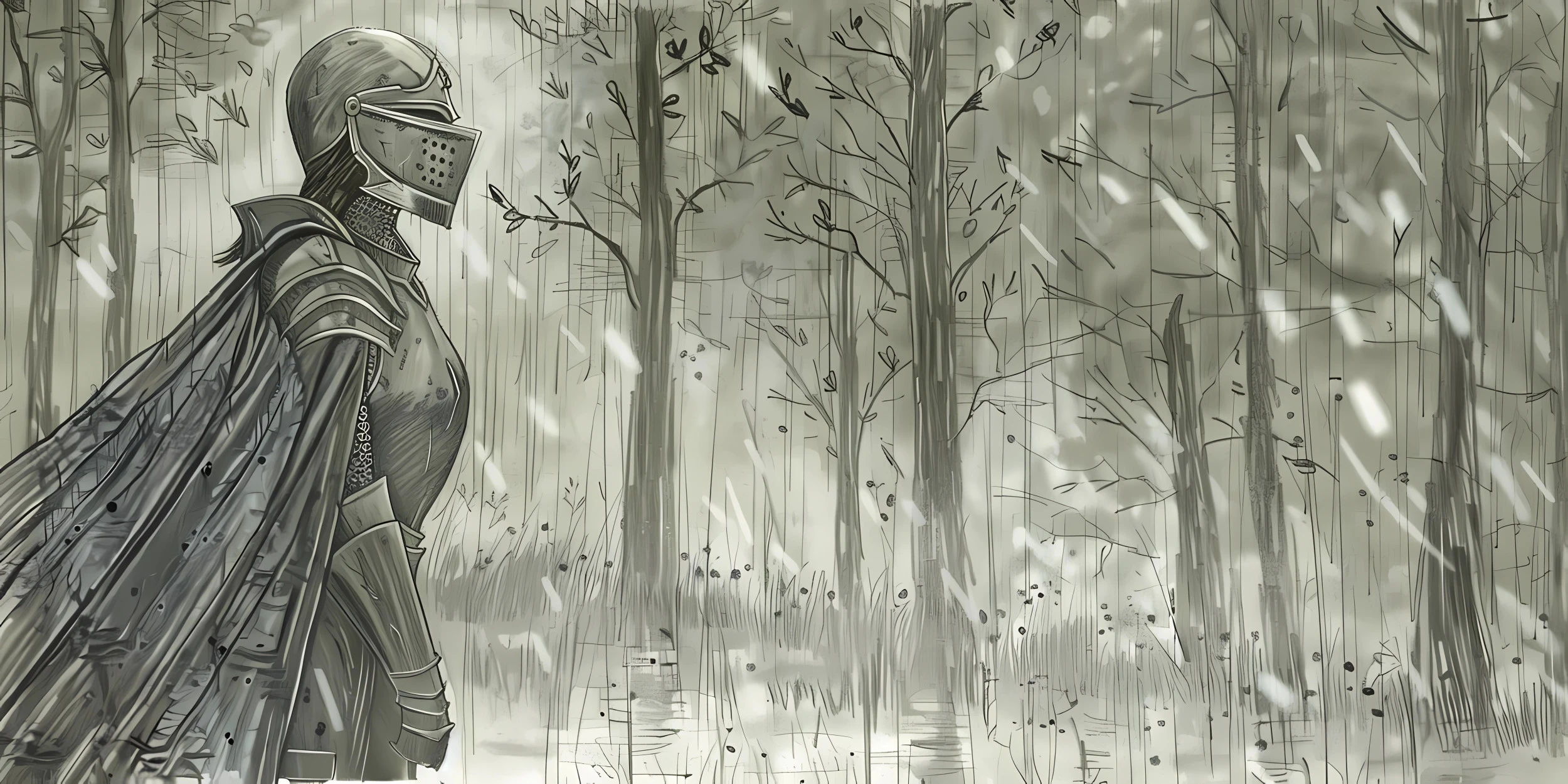 Ce papier peint noir et blanc d’exception révèle un chevalier solitaire, figure emblématique drapée dans son armure ancestrale, se dressant majestueusement au cœur d’une forêt enchantée. L’illustration, réalisée dans un style dessin au trait d’une finesse remarquable, évoque les plus belles gravures médiévales avec ses détails ciselés et sa technique graphique sophistiquée. Les nuances de gris subtiles créent une profondeur saisissante, tandis que les tons monochrome apportent une élégance intemporelle à cette scène narrative captivante.