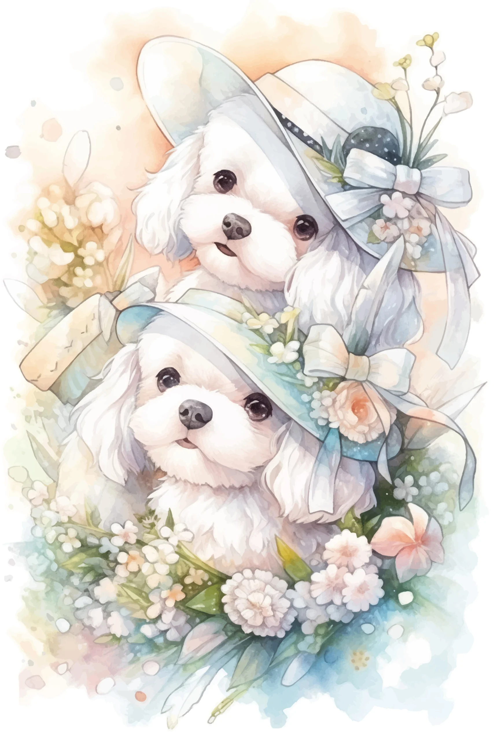 Plongez dans un univers de tendresse infinie où deux adorables petits chiens blancs aux regards pétillants se parent de délicats chapeaux fleuris, créant une symphonie visuelle d’une douceur absolue.
