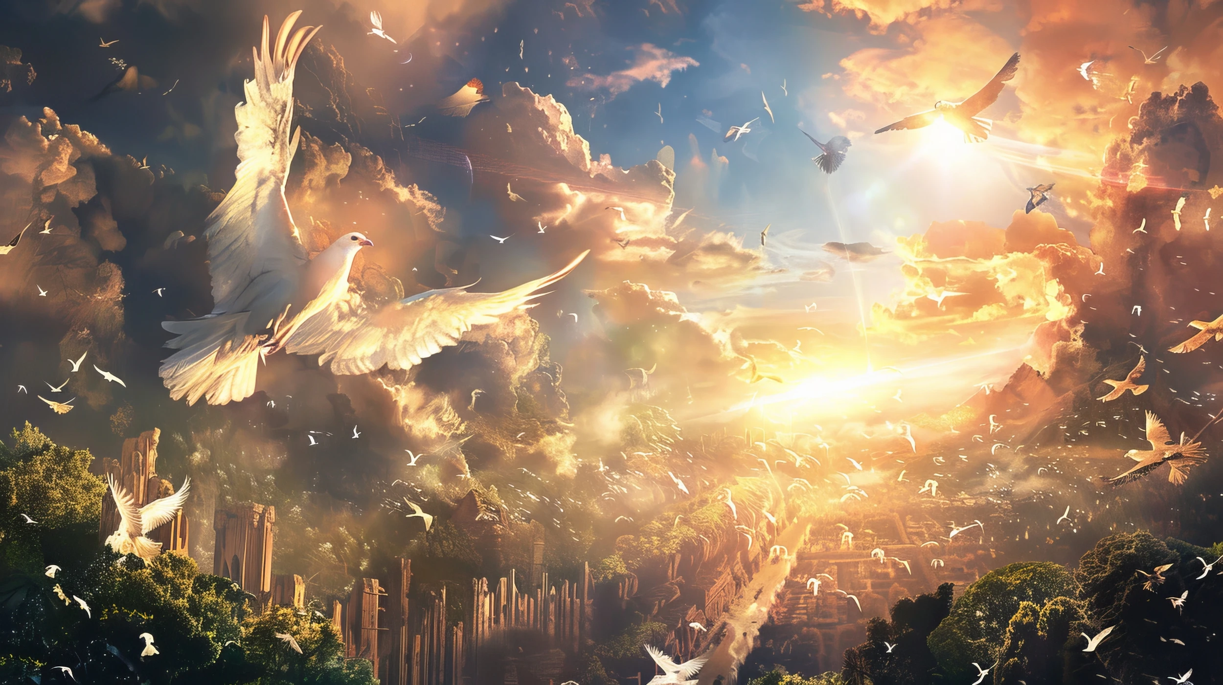 Laissez-vous transporter vers les cieux par cette vision céleste où doves blanches et oiseaux majestueux évoluent dans un ballet aérien d’une beauté saisissante, baignés par les lumières dorées d’un coucher de soleil éternel.