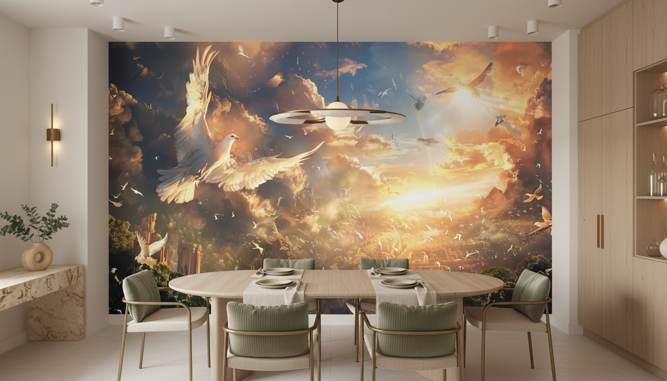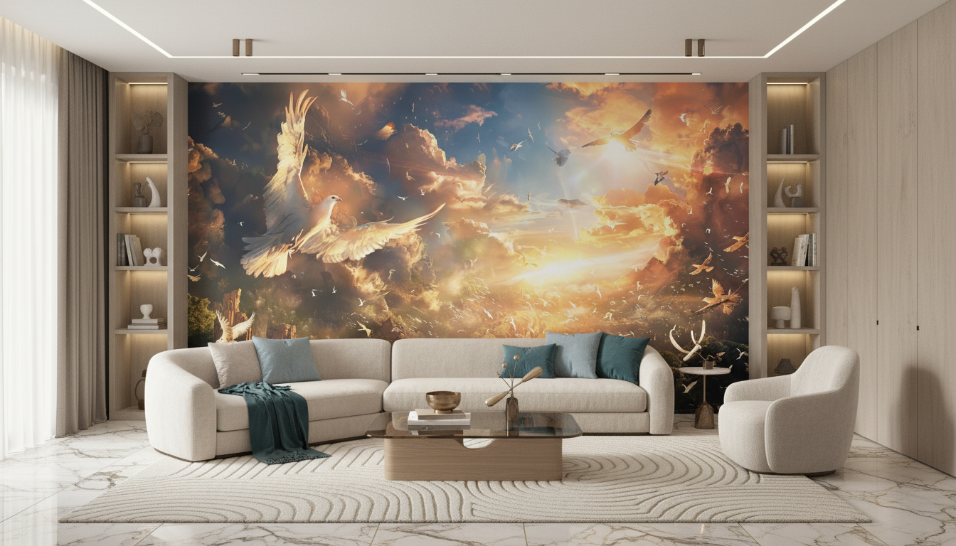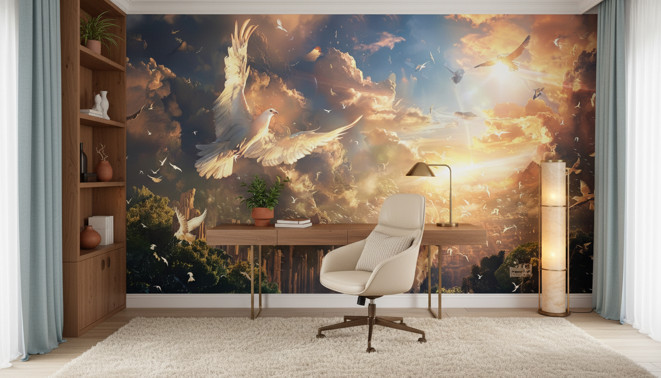 L’atmosphère qui émane de ce papier peint décoratif est celle d’une sérénité spirituelle mêlée de grandeur épique. Cette fresque murale transforme instantanément votre espace en sanctuaire de paix, où règne une ambiance contemplative et apaisante. Le mouvement perpétuel des oiseaux insuffle une énergie positive tout en conservant une dimension méditative profonde. Cette décoration d’exception crée un véritable cocon de bien-être, propice à l’évasion et à la rêverie.