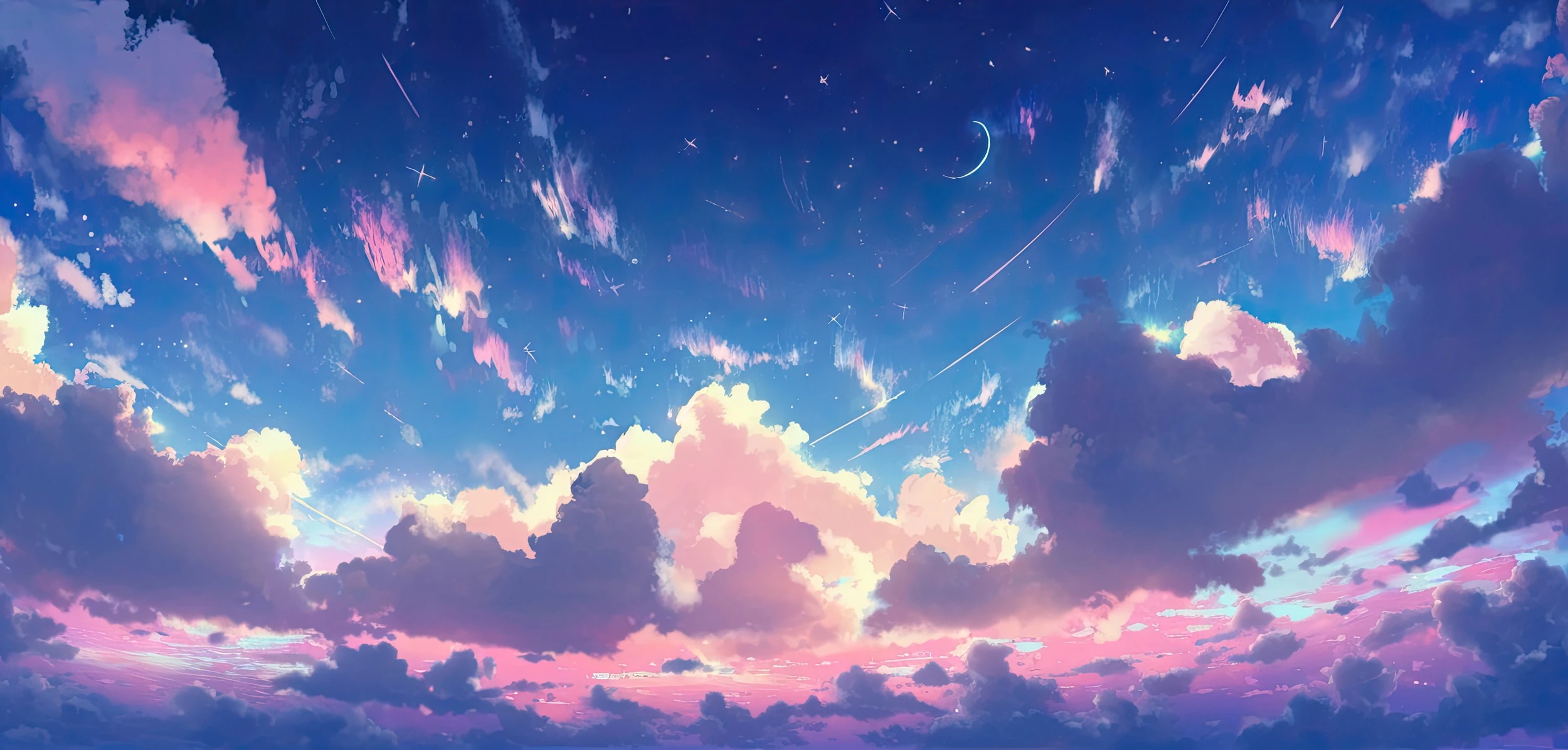Le style graphique de ce papier peint ciel étoilé évoque la technique de la peinture numérique aux influences manga et anime, avec des rendus de lumière particulièrement soignés qui donnent vie à chaque volute nuageuse. La palette chromatique oscille entre les bleus profonds du firmament nocturne et les tons pastel rosés des nuages illuminés, créant un contraste harmonieux d’une douceur infinie.