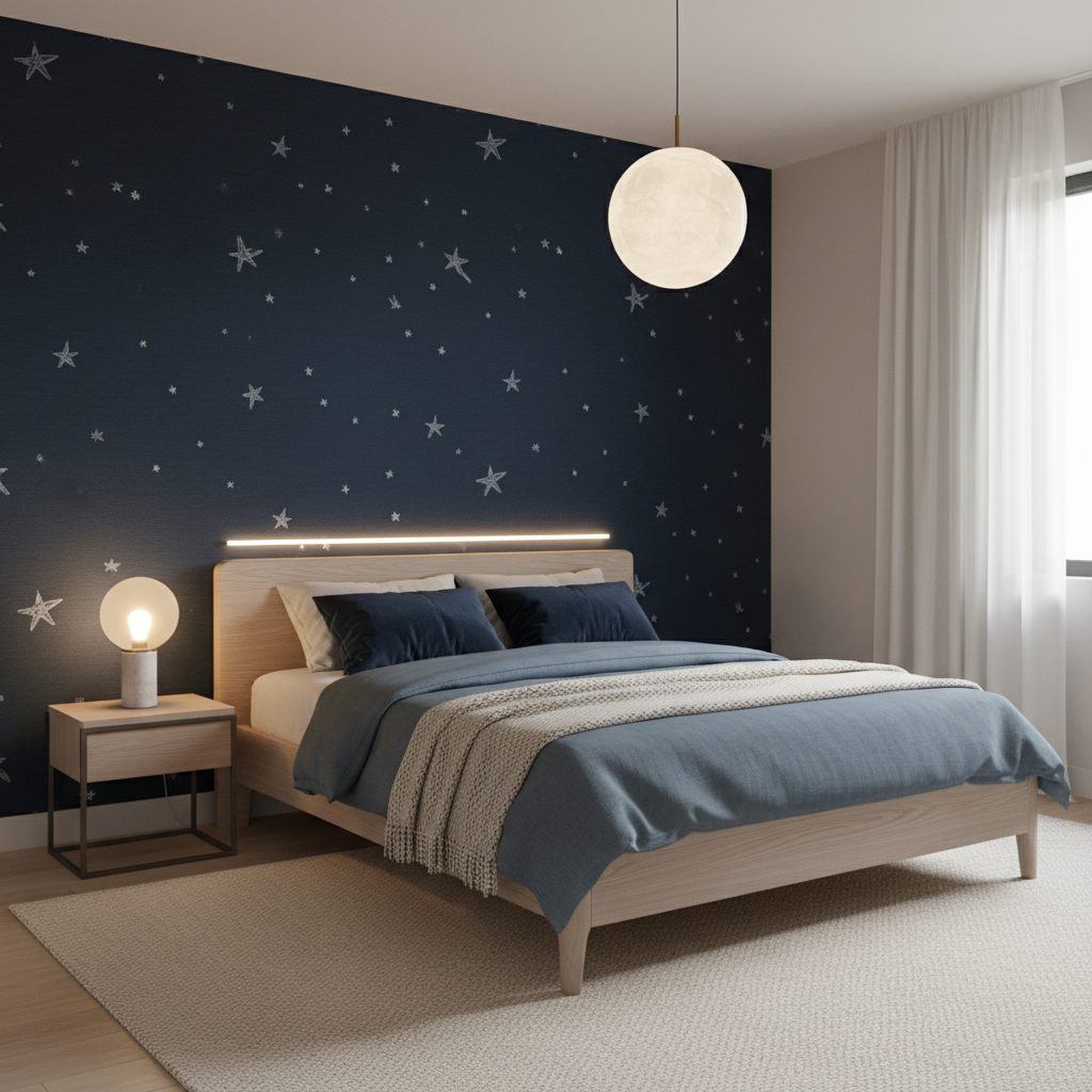 L’éclairage joue un rôle crucial dans la mise en valeur de ce papier peint design étoilé : privilégiez des appliques murales tamisées, des suspensions en métal doré ou des lampes à poser diffusant une lumière chaude qui révélera toute la magie des motifs stellaires. Les amateurs de décoration céleste pourront compléter l’ambiance avec des objets déco évoquant l’astronomie : globes terrestres anciens, télescopes vintage, ou encore des coussins brodés de motifs lunaires.