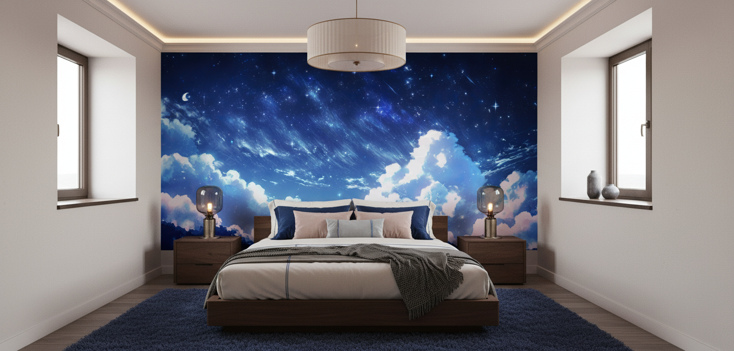 Idéal pour habiller un mur de chambre parentale, ce papier peint ciel étoilé transformera votre espace nuit en véritable observatoire poétique. Dans une chambre d’enfant, il stimulera l’imagination et accompagnera les plus beaux songes. Un salon zen ou un bureau créatif bénéficieront également de cette atmosphère inspirante. Associez-le à du mobilier blanc laqué ou en bois clair pour préserver la pureté de l’ensemble, complétez avec des textiles en lin naturel ou en velours bleu nuit. Des accessoires dorés ou en laiton brossé rappelleront subtilement l’éclat des étoiles.