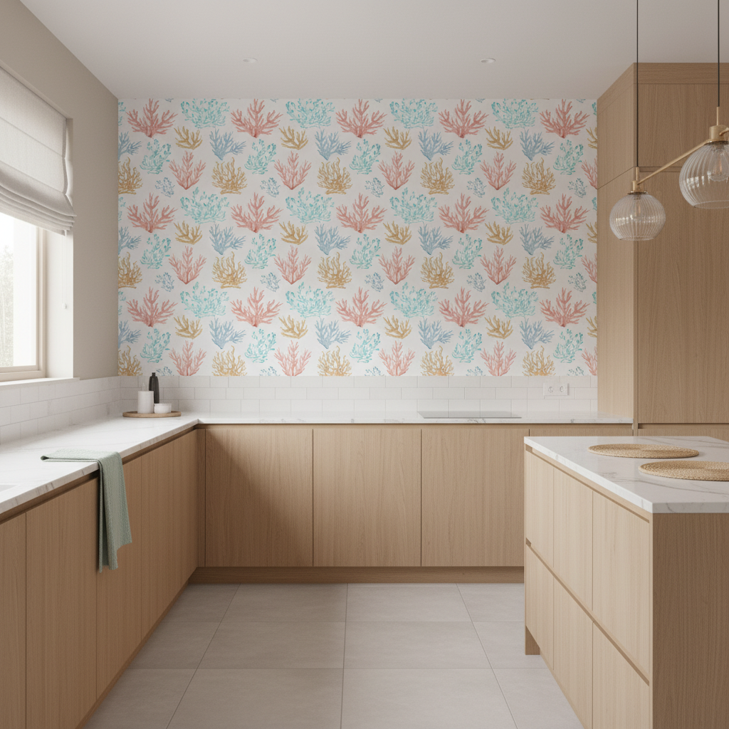 Plongez dans l’océan avec ce papier peint coraux aquarelle.,Motifs marins bleus, roses, beiges pour une ambiance tropicale chic.,Créez un décor mural apaisant et sur mesure.,Idéal salon, chambre ou salle de bain.