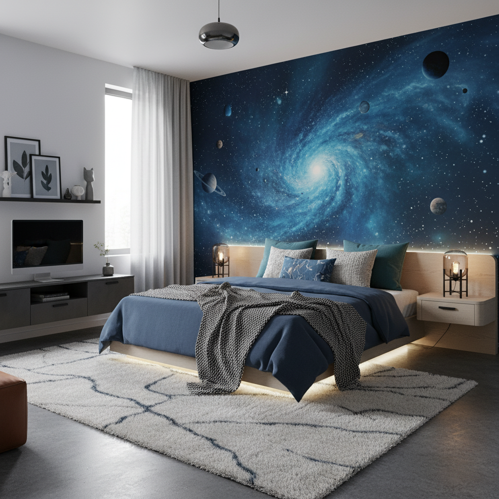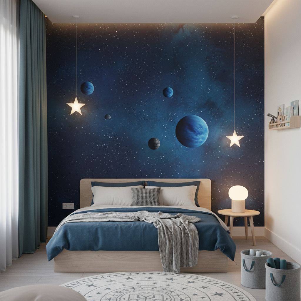 Ce papier peint univers trouve sa place idéale dans une chambre parentale pour créer un cocon nocturne apaisant, un bureau créatif stimulant l’inspiration, ou encore une chambre d’adolescent passionné d’astronomie. Dans un salon contemporain, il constitue un mur d’accent spectaculaire qui capte tous les regards. Associez-le à du mobilier aux lignes épurées en métal brossé ou laque blanche, des textiles en velours bleu nuit et des accessoires en cuivre rosé pour créer un contraste chaleureux. Les éclairages LED indirects sublimeront les nuances bleutées et accentueront l’effet immersif.