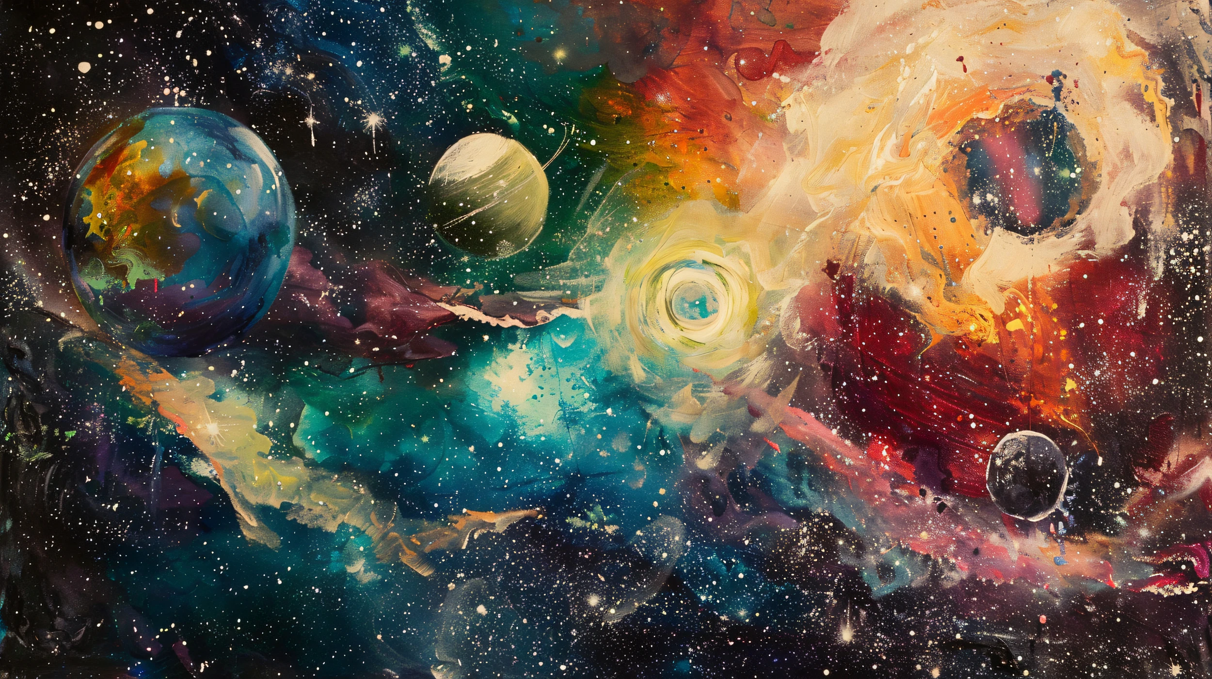 Cette œuvre murale exceptionnelle déploie un paysage spatial fantastique d’une richesse visuelle saisissante. Des planètes mystérieuses aux teintes turquoise et dorées flottent majestueusement dans un océan d’étoiles scintillantes. Au cœur de cette composition, des nébuleuses colorées aux nuances flamboyantes – rouge vermillon, orange cuivré, jaune solaire – créent un contraste saisissant avec les zones plus sombres parsemées de constellations brillantes. Le style artistique mêle harmonieusement peinture à l’huile et techniques mixtes, offrant des textures riches où se mélangent coulures spontanées et détails minutieusement travaillés. Les tons cosmiques naviguent du bleu profond de l’espace intersidéral aux teintes chaudes des explosions stellaires, créant une palette chromatique d’une sophistication rare.
