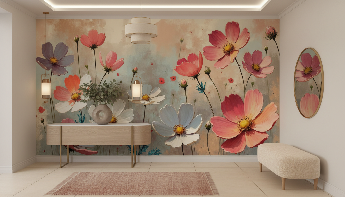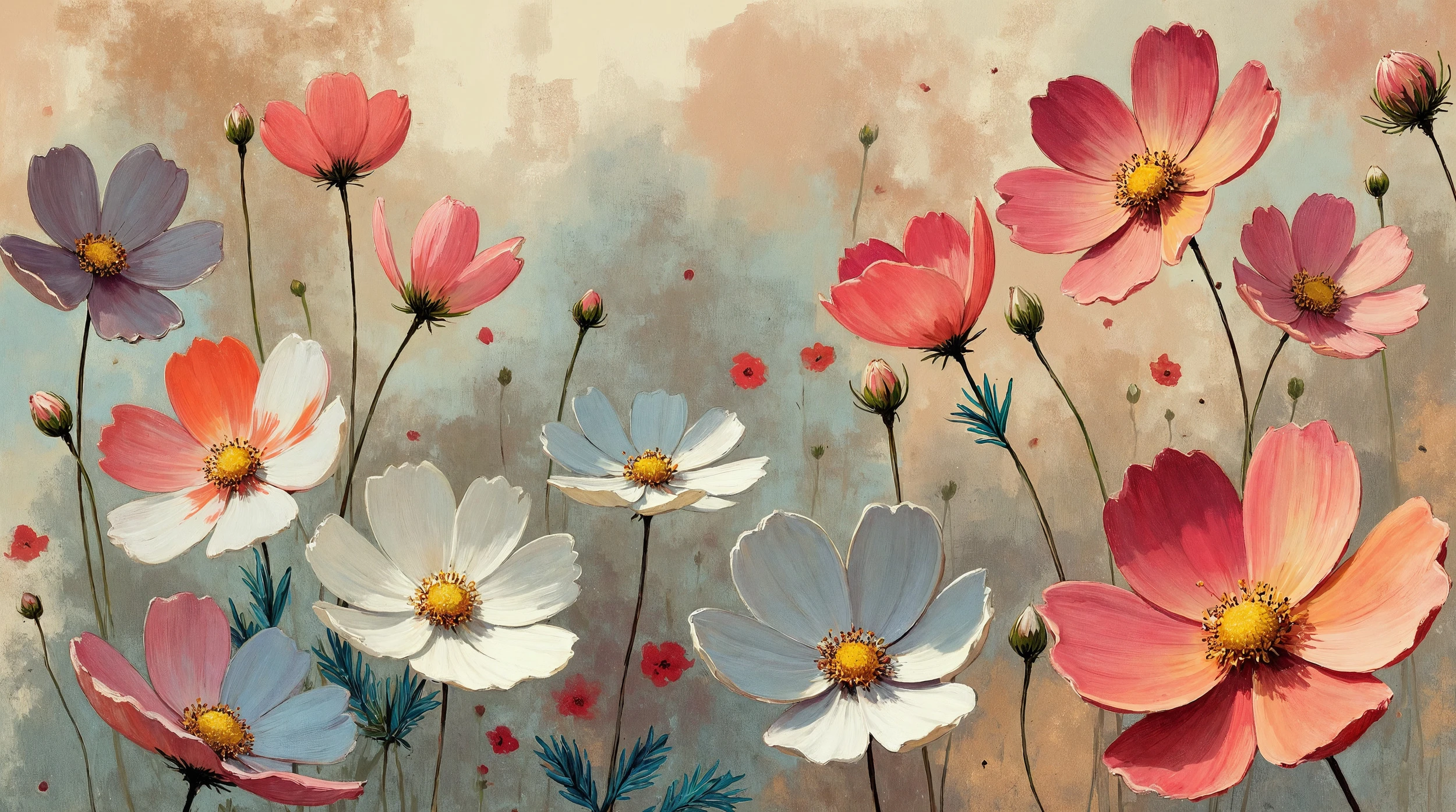 Ce papier peint floral d’exception capture toute la poésie d’un champ de cosmos en aquarelle, dans une composition artistique d’une rare délicatesse. Les fleurs aux pétales soyeux se déploient dans un camaïeu enchanteur, oscillant entre les roses poudrés, les blancs nacré, les corails tendres et les violets pastel. Chaque corolle révèle un cœur doré lumineux, comme autant de petits soleils parsemés sur un fond nuageux aux tons beiges et gris subtilement patinés.