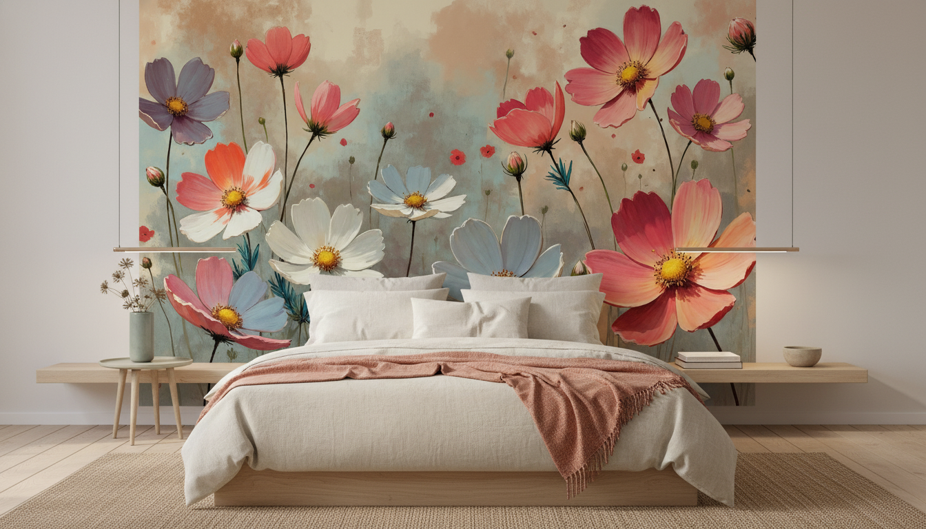 Ce papier peint cosmos trouve sa place idéale dans une chambre parentale, où il créera une ambiance propice à la détente et au repos. Il sublimera également un salon cosy en habillant un pan de mur derrière un canapé en lin écru ou velours rose poudré. Dans une chambre de petite fille, il évoquera un jardin secret enchanteur. Pour un bureau à domicile, il apportera cette touche de nature inspirante si précieuse à la créativité.