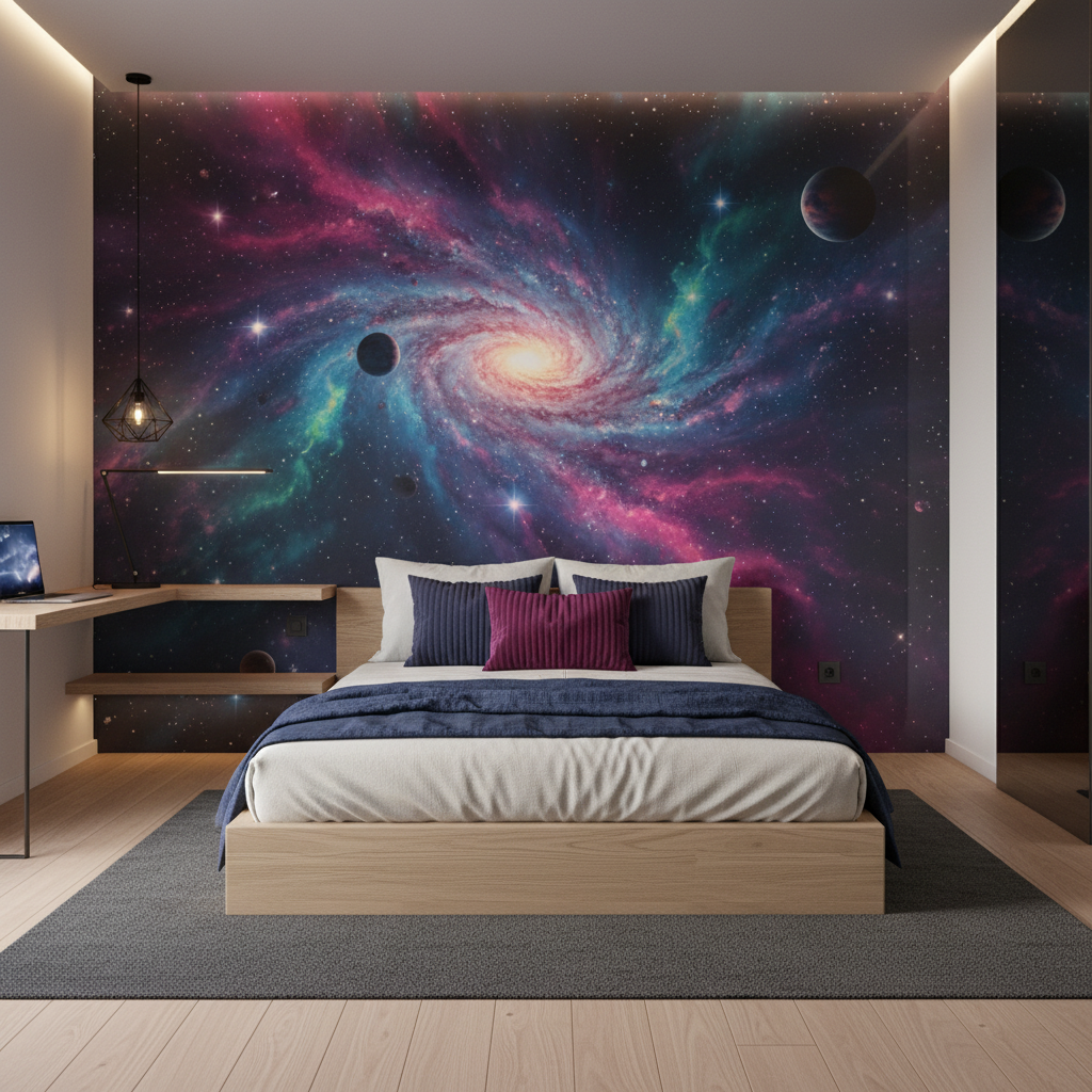 Ce papier peint moderne espace trouve naturellement sa place dans un salon contemporain où il constituera un point focal spectaculaire derrière un canapé épuré. Dans une chambre parentale, il créera une atmosphère propice aux rêves les plus extraordinaires, particulièrement mis en valeur par un éclairage tamisé et indirect. Les bureaux créatifs et espaces de travail bénéficieront également de cette source d’inspiration cosmique qui stimule l’imagination et la réflexion.